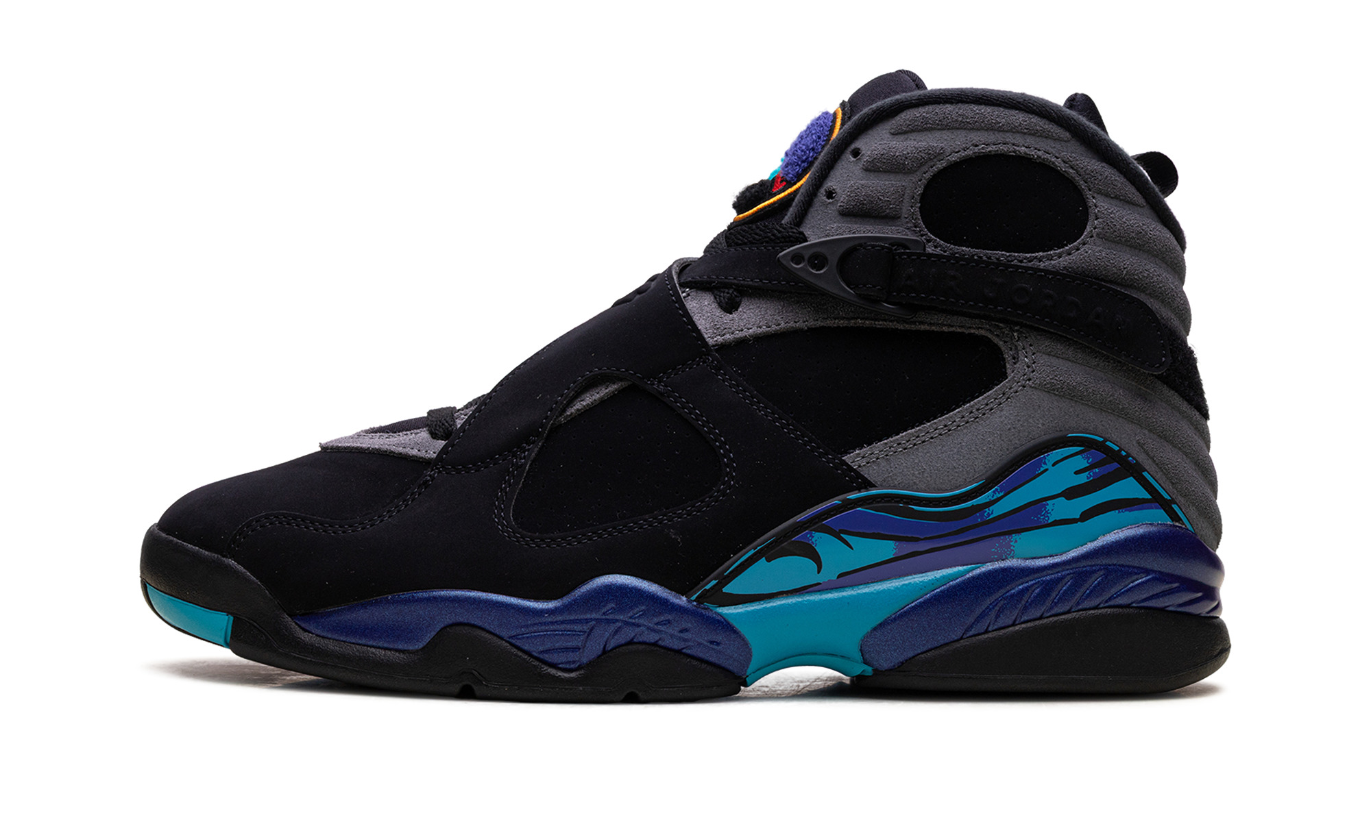Make a vibrant statement with the unmistakable style of the Air Jordan 8 "Aqua." The bold black nubuck upper is highlighted by the iconic aqua and concord accents on the midsole and signature chenille tongue logo. The distinctive cross straps add to its standout look, making this colorful retro a must-have for any sneaker enthusiast.