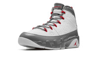 The Air Jordan 9 “Fire Red” is a colorway of Michael Jordan’s ninth signature shoe that is loosely inspired by the Chicago Bulls. As with other classic and popular Air Jordans in “Fire Red” colorway, this Jordan 9 features a fiery shade of red that is found on the Bulls’ team uniforms. The shoe features a white leather construction with a contrasting grey patent leather mudguard overlay that extends from the toe up to the collar. Fire Red accents are found on the eyelet loops, on the pull tab on the heel, and on the “Jordan” branding on the tongue. A Fire Red Jumpman also appears on the lateral side of the white foam midsole. Release date: November 23, 2022