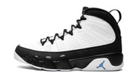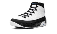 The Air Jordan 9 “University Blue” is a clean look for Michael Jordan’s ninth signature shoe that draws comparisons to the original “UNC” or “Powder Blue” colorway from 1994. Collectors may recall “His Airness” suiting up in his old UNC Tarheels team uniform while wearing the OG “Powder Blue” Jordan 9 for Nike advertisements during his brief hiatus from the NBA in the mid ‘90s, and the “University Blue” design pays homage to the “UNC” theme with subtle accents. The upper features a white leather construction with a “diamond” motif appearing along the medial and lateral sides of the shoe. A speckled black synthetic nubuck mudguard above the black painted midsole breaks up the look. Elsewhere, black rubber eyelets and rope laces contrast the white mesh tongue. Branding appears on the form of University Blue “23” embroidery on the heel and “Air Jordan” on the tongue. Additional “UNC” inspired accenting can be found on the mini Jumpman emblem on the sole and on the “globe” insignia on the heel. A black nylon pull tab on the heel and inner bootie lining complete the look of the Jordan 9 “University Blue.” Release date: December 5, 2020.