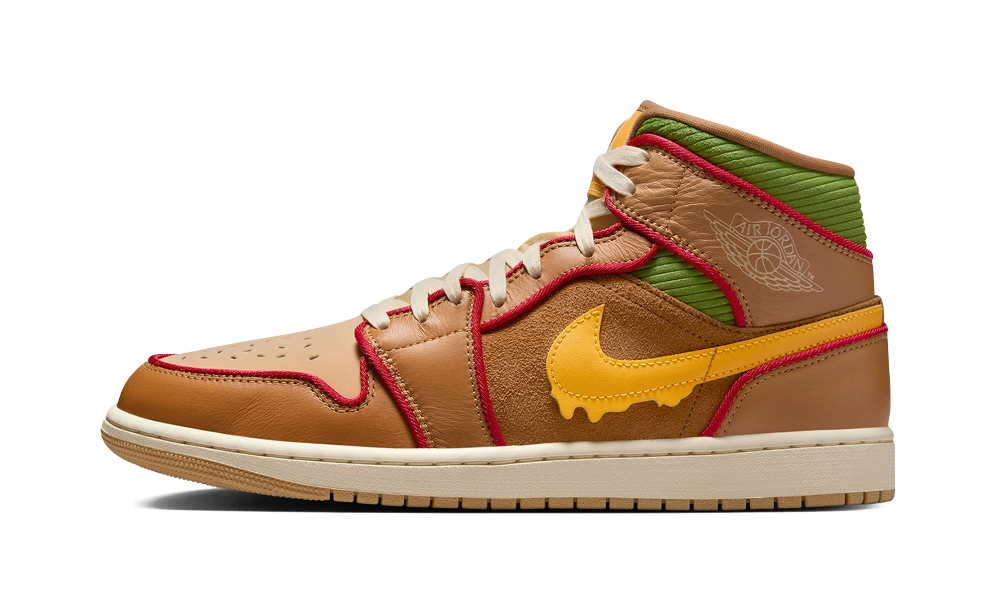 Get a taste of truly unique sneaker design with the playful Jordan 1 Mid SE "Cheeseburger." This special edition uses a mix of premium leather and suede to cleverly emulate the iconic American meal. Featuring bun-colored tan, lettuce-green ankle padding, ketchup-red accents, and a yellow "melting cheese" Swoosh, every detail is mouth-watering. With the classic Air cushioning, these are the fun, flavorful kicks that are guaranteed to spark conversation.