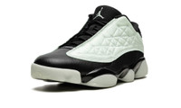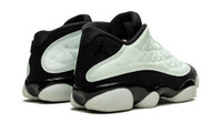 The Air Jordan 13 Low “Singles Day” is a November 2021 release of Michael Jordan’s thirteenth signature shoe in a colorway dedicated to the light-hearted, unofficial holiday of people not in relationships. Singles Day originated in China in the early ‘90s before becoming global in the 2010s. Landing on November 11th, or 11/11, Singles Day is also recognized as the biggest online shopping day in the world. As for the colorway, Jordan Brand arranges the low-top version of the vintage basketball shoe with a Barely Green leather upper that features a triangular geometric design. “Matrix” style “Air Jordan 0023,” “Air Jordan 2021,” and “1111” within the mint green leather design are made visible with glow-in-the-dark accenting. A black Jumpman emblem appears on the collar, a Barely Green Jumpman is embroidered on the black nylon tongue, and “Jordan” text appears on the vamp. A black midsole contrasts the mint green rubber outsole. Release date: November 11, 2021