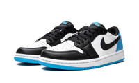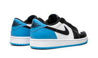 The Women’s Air Jordan 1 Low OG “UNC” is a women’s-exclusive release that remixes the model’s original colorway inspired by the North Carolina Tar Heels’ team uniform colors. Based on the Jordan 1 “UNC” from 1985, the “UNC” Women’s Jordan 1 Low OG switches up the original’s color block with black leather overlays on the toe, forefoot, and eyelets. A black leather Swoosh can be found on either side. Both the perforated toe and mid-panel are designed in white leather. Dark Powder Blue leather appears on the heel. A black “Wings” logo is found on the back of the shoe, and blue “Nike Air” branding is located on the black nylon tongue tag. Underfoot, a white rubber midsole and Dark Powder Blue outsole complete the look.