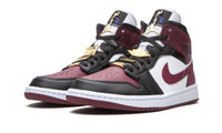 The Women’s Air Jordan 1 Mid “Gold Pendants” is a women’s exclusive edition of Michael Jordan’s first signature shoe in mid-top. The special release is highlighted by gold hardware accessories incorporated into its design. Celebrating not only the model’s history but also the significance of women in sneaker culture, the aforementioned accessories add another dimension of style to the Jordan 1 Mid. Dark Beetroot leather appears on the perforated toe, collar, and heel. The same burgundy hue is used on the leather Swoosh detailing on either side of the shoe. Crisp white leather can be found on the mid-panel and black leather overlays are located on the forefoot, eyelets, and collar underlay to balance out the look. A gold Jumpman emblem hangs from a clasp attached to a loop on the tongue tag while “Wings,” “1985,” and “Women” dubraes are woven into the design of the laces.