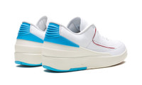 The Women’s Air Jordan 2 “UNC to Chicago” is a women’s-exclusive colorway of Michael Jordan’s second signature shoe that shows appreciation for his two former basketball teams. Originally appearing on the Air Jordan 1, the “UNC to Chicago” theme makes its way onto the Jordan 2 Low as part of the vintage basketball shoe’s comeback in 2022 and 2023. The design features the familiar color schemes of both the North Carolina Tar Heels and the Chicago Bulls, Jordan’s college and professional basketball teams. The shoe features a white leather construction with contrasting University Blue accenting on the heel, which is a nod to the Tar Heels. Fiery red detailing inspired by the Bulls’ primary team uniform color is found on the underlay on either side of the shoe. Red “Wings” branding appears on the tongue. The cream accenting on the back of the shoe and on the mid-panel gives the design a decidedly aged look. Release date: March 8, 2023