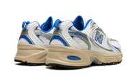 The New Balance 530 “White/Blue Oasis” is a colorway of the classic running and lifestyle shoe with an aged, vintage look. Introduced in 1992, the New Balance 530 has been both a running shoe and, in the present day, a casual shoe. On this “White/Blue Oasis” colorway, the model features a white mesh base with white and metallic silver leather overlays. A textured white “N” with Blue Oasis-colored trim appears on both sides, while a “530” logo can be seen on the lateral side of the heel. Classic “NB” detailing is embroidered on the tongue. Underfoot, the shoe’s chunky, foam midsole is given an aged look. It features New Balance’s signature ABZORB cushioning for all-day comfort.