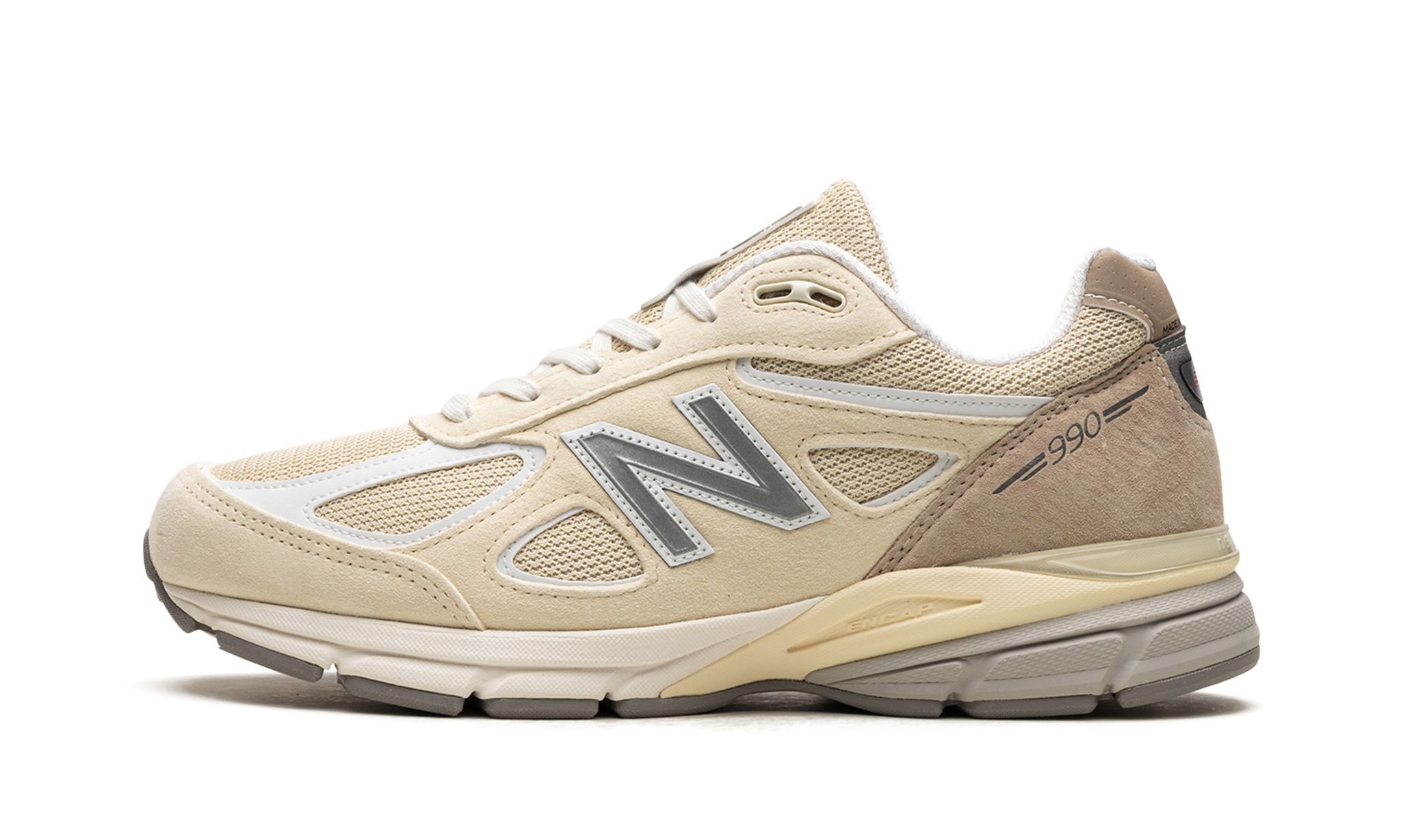 The New Balance 990v4 "Made in USA - Cream" is a versatile colorway of the fourth edition of the lifestyle shoe. From New Balance’s “Made in USA” collection designed by Aimé Leon Dore’s Teddy Santis, the 990v4 “Made in USA - Cream” colorway features a cream mesh upper with tonal suede on the toe and leather overlays throughout the design. A grey “N” logo appears on the side while grey “990” branding is found on the tan suede overlay on the heel. Additional branding comes into play on the red “NB” hit on the heel and on the “New Balance” logo on the tongue. ENCAP cushioning in the midsole provides all-day wearability. Release date: July 27, 2023