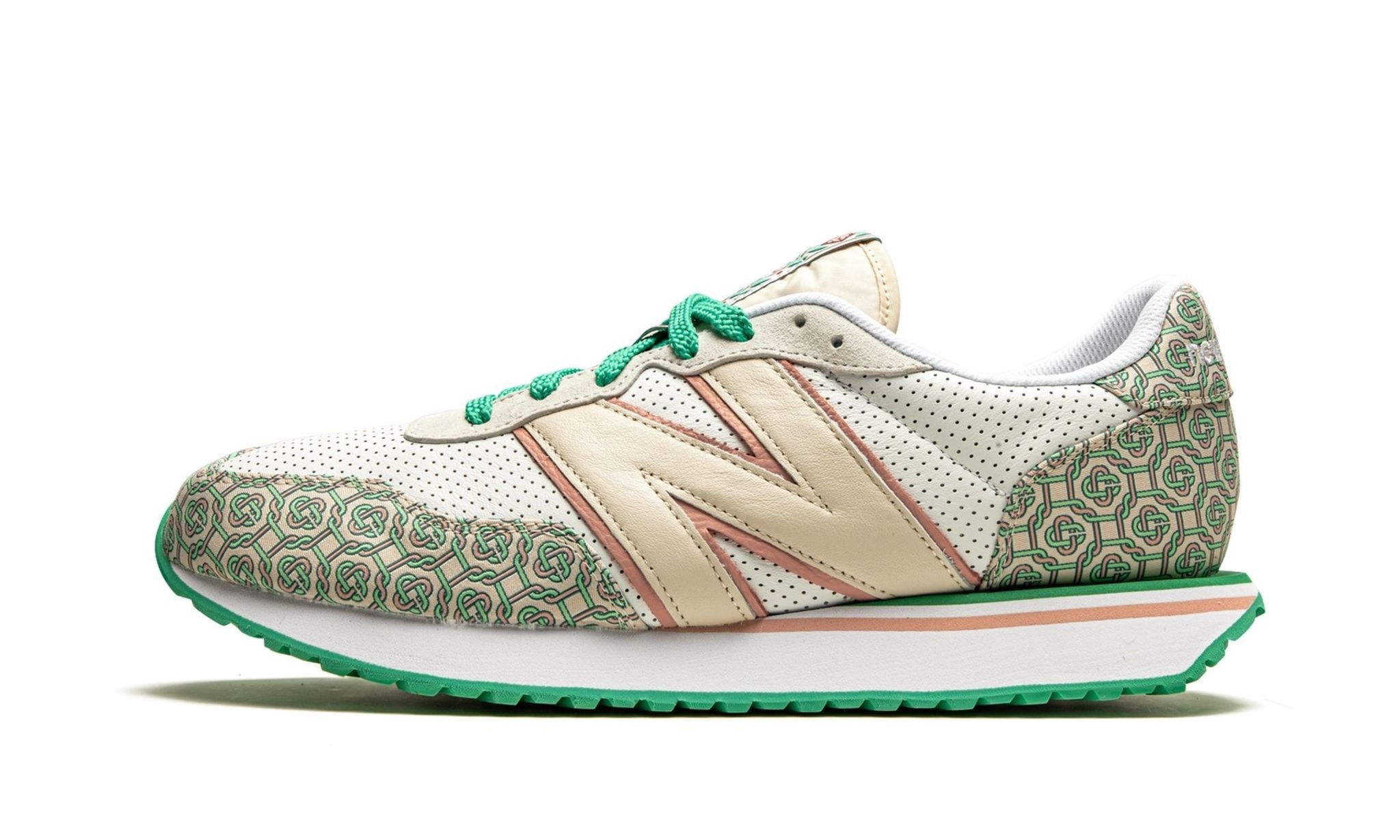 The Casablanca x New Balance 237 marks the third collaboration between the luxury fashion brand and New Balance. A March 2021 release, the New Balance 237 by Casablanca dresses up the heritage footwear brand’s retro infused low-top shoe with the fashion label's flavorful monogram print. The premium pattern appears on the toe and heel and contrasts the white dotted leather base of the upper. In addition to the attention grabbing monogram print, Casablanca adds another exciting design element to the upper with the oversized tan leather “N” logo stitched onto both sides of the shoe. Green laces are layered over the floral motif that adorns the nylon overlay on the cream tongue. On the heel, white New Balance embroidery furthers the refinement of the design. The white foam midsole is contrasted by a green rubber outsole with a zig-zag tread that calls to mind the styling of vintage running shoes. Release date: March 5, 2021.