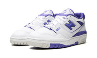 The Women’s New Balance 550 “Aura Purple” is the women’s sizing of the vintage basketball shoe in a two-tone, white-and-purple design. The upper features a combination of smooth and dotted leather on its toe, heel, and mid-panel, respectively. An Aura Purple “N” logo appears on either side of the shoe and purple “550” branding dots the forefoot. Additional logo detailing includes “NB” insignia on the heel and “New Balance 550” branding on the tongue. A white rubber midsole and grey and purple outsole complete the look.