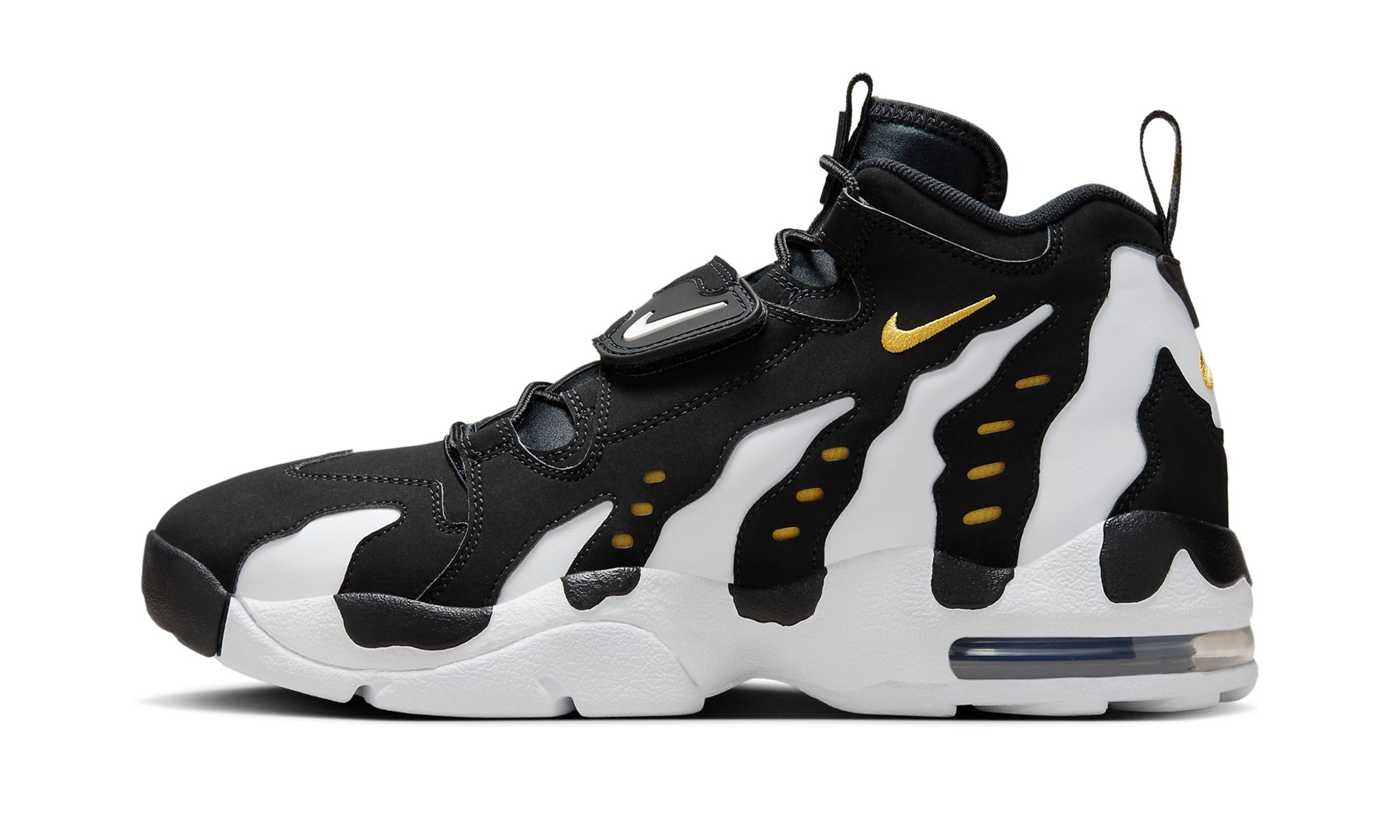 The Nike Air DT Max '96 "Black Varsity Maize" is an original colorway of Deion Sanders’ signature shoe that was originally released in 1996. After rekindling its relationship with Sanders in July 2023, Nike brought back the former NFL and Major League Baseball star’s Air DT Max ‘96 signature shoe in its “Black Varsity Maize” colorway for the first time in several years. The upper features a black nubuck construction with claw-inspired detailing in the form of white leather panels. Deion’s signature goalpost x home plate logo appears on the tongue. A velcro midfoot strap provides a lockdown fit for fans of this iconic, ‘90s-era shoe from Nike’s golden years.