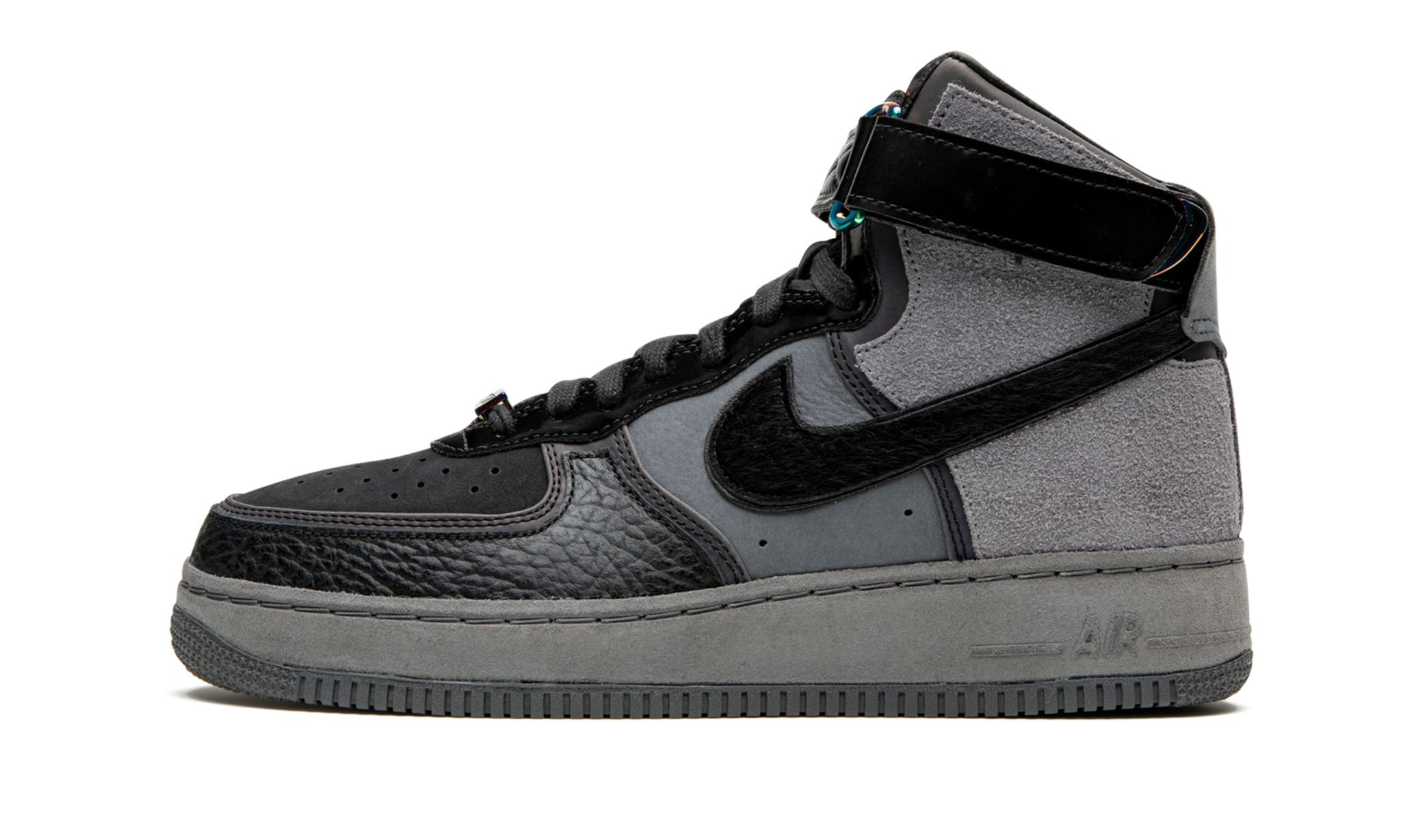 The A Ma Maniére x Nike Air Force 1 High “Hand Wash Cold” is a high fashion-leaning collaboration between the Washington D.C. retailer and Nike on the classic high-top shoe. Dealing with fine goods and materials, the “Hand Wash Cold” colorway is an ode to premium materials and their delicate care. A Ma Maniére presents their collaborative offering with a black leather toe cap and black nubuck perforated toe. A dark grey leather mid-panel features a black leather Swoosh that is contrasted by a grey woolly suede heel. Iridescent Nike lace locks appear at the throat of the shoe with an adjustable black nubuck ankle strap pulling the shadowy look together. The A Ma Maniére x Nike Air Force 1 High “Hand Wash Cold” released in extremely limited quantities on December 7, 2019.