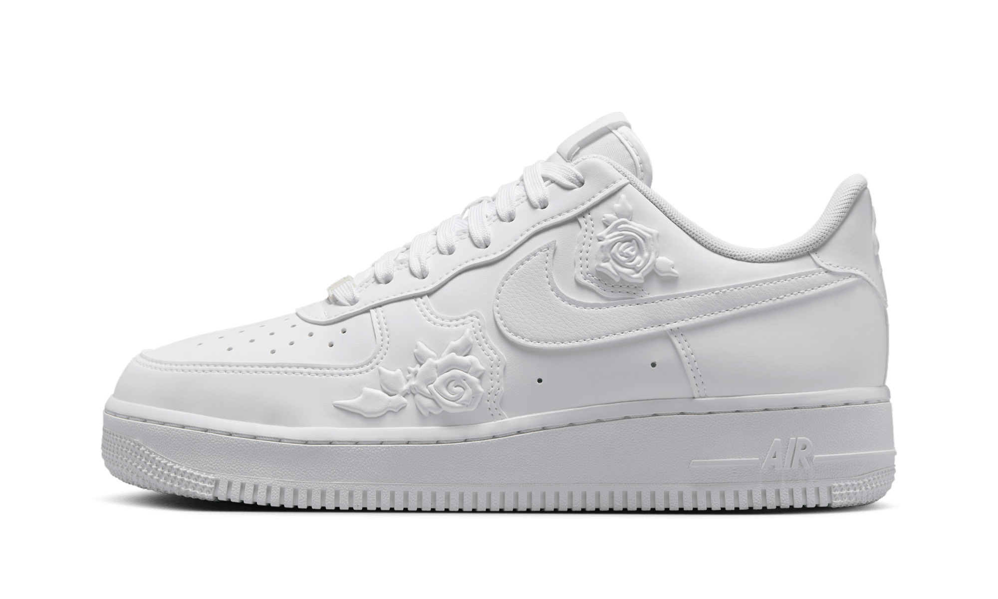 The Nike Air Force 1 '07 gets a romantic, elevated makeover in the "White Roses" colorway, a women's exclusive release that adds subtle, intricate detailing to the timeless all-white classic. Part of a themed pack, this shoe is an understated ode to elegance and romance.