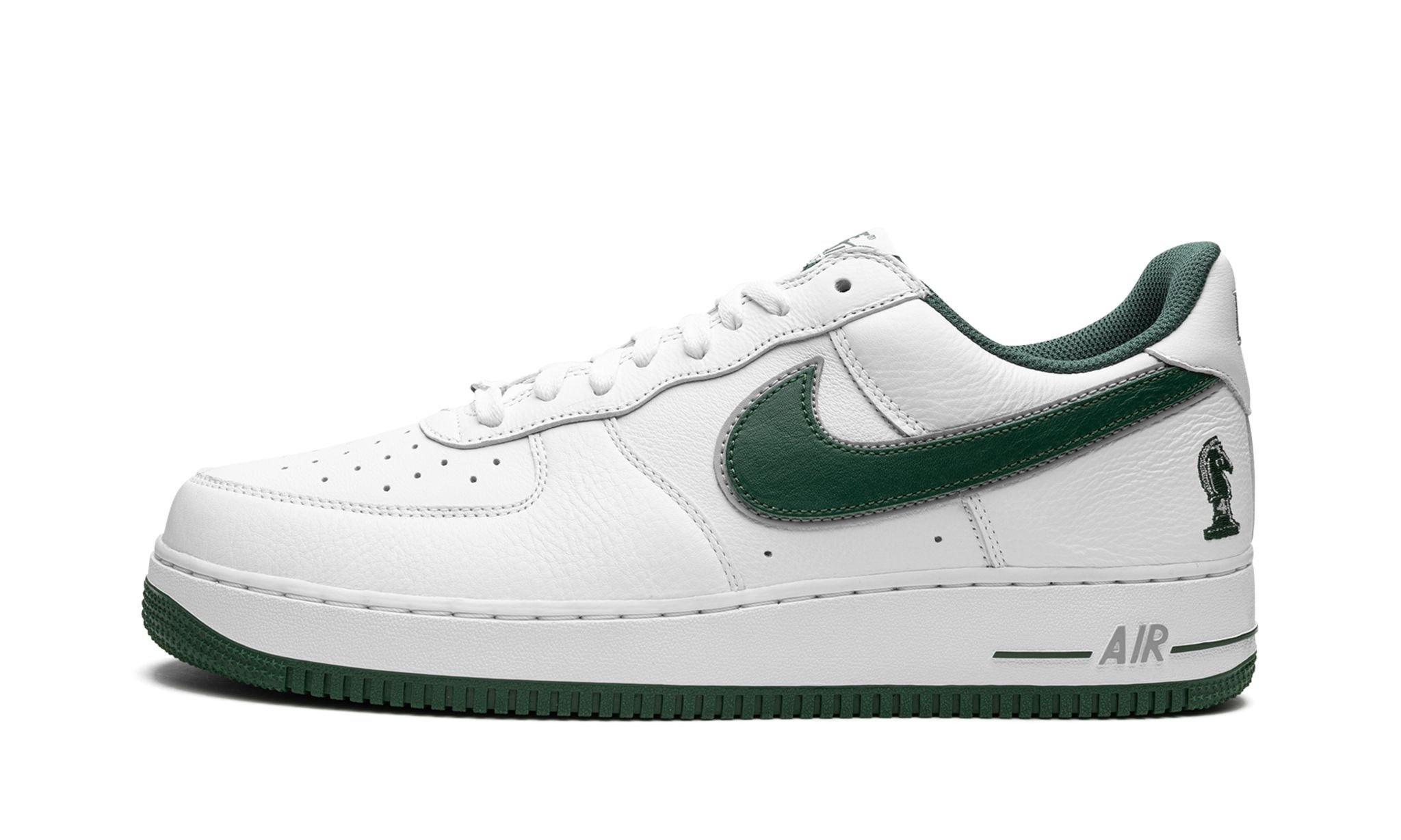 The Nike Air Force 1 Low “Four Horsemen” is a colorway of the classic basketball and lifestyle sneaker that debuted in 2003 as part of the celebration of LeBron James signing with Nike. Brought back by Nike in 2023, the “Four Horsemen” shows love to LeBron and his inner circle of friends and business partners, including Maverick Carter, Rich Paul, and Randy Mims—otherwise known as “The Four Horsemen,” a moniker inspired by the Ric Flair-led pro wrestling group of the same nickname. The shoe features a white leather construction with a green embroidered knight chess piece “Horsemen” logo on the lateral side of the heel. A Deep-Forest-colored leather Swoosh appears on the sides, completing the look of this modern reissue of a classic sneaker from Nike’s vault. Release date: April 27, 2023