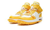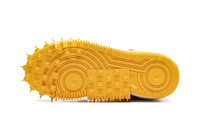 The Off-White x Nike Air Force 1 Mid “Varsity Maize” is a collaboration between the high fashion and streetwear brand and Nike on a contemporary-looking version of the retro mid-top shoe. The Air Force 1 Mid by the late Virgil Abloh’s Off-White clothing brand succeeds its previous Air Force 1 Low projects that were released from 2017 through 2022. The “Varsity Maize” features a white leather upper with Varsity Maize-colored leather overlay panels and leather Swoosh branding. A Varsity Maize leather ankle strap appears on the collar. Off-White’s signature dual lacing system gives the design a futuristic appearance. Off-White’s industrial-style branding is printed on the medial side of the shoe. A grim reaper motif is embroidered in white on the lateral side of the heel. A wavy midsole and a spiked outsole complete the look. Release date: November 9, 2023