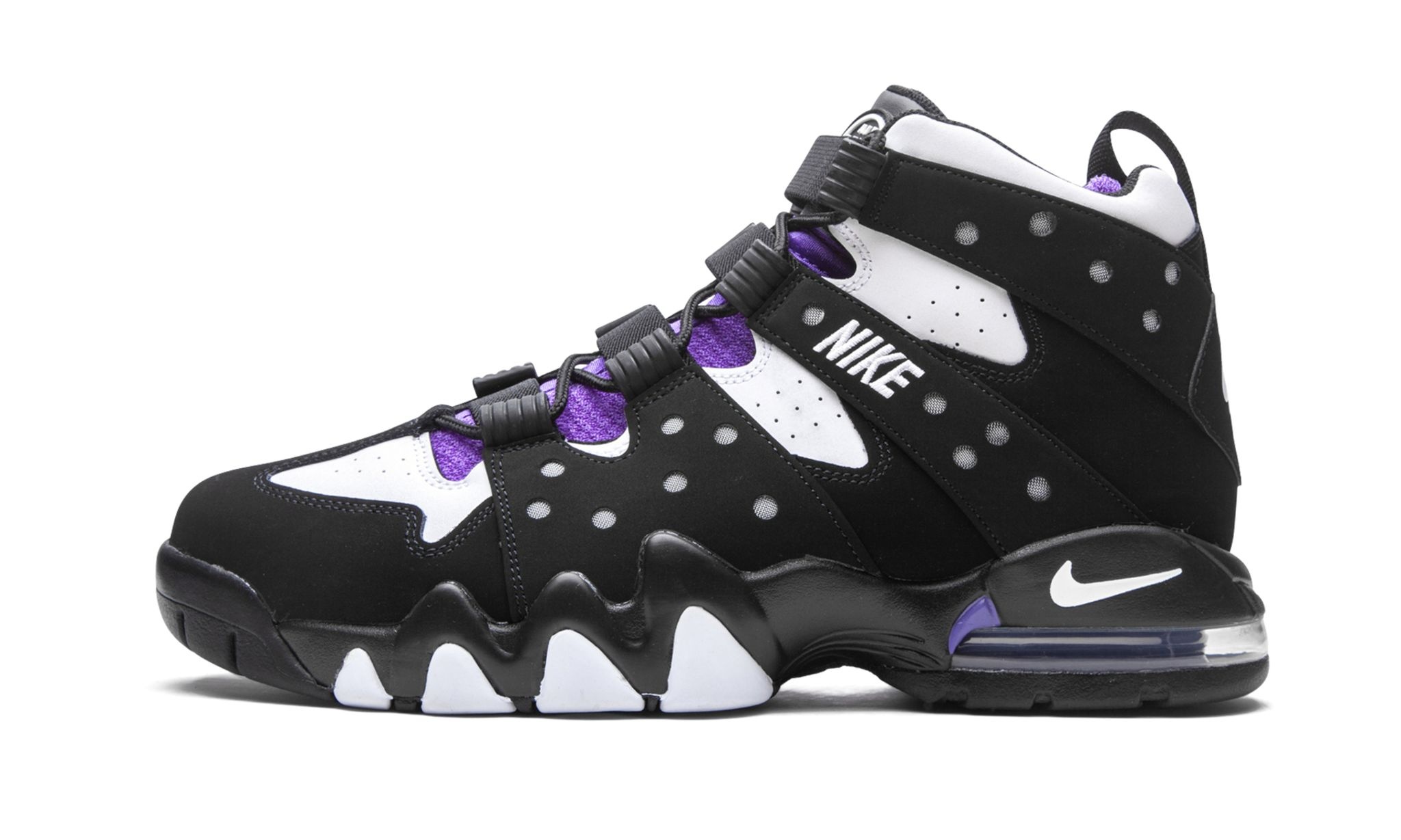 The Nike Air Max 2 CB ‘94 “2020 Retro” is an original colorway of Charles Barkley’s signature performance basketball shoe from the ‘90s. Quintessentially retro from a design standpoint, the Air Max 2 CB ‘94 returns in its true-to-original form for this Fall 2020 release. The design by Tinker Hatfield, which is inspired by the look of a straitjacket, features a split white leather and black synthetic nubuck design along the eyelets and midsole, respectively. White “Nike” embroidery appears on the midfoot harness that supports the lacing system. Additional details include purple accenting on the nylon tongue, white “Nike Air” embroidery on the heel, and a mini Swoosh on back of the midsole. A visible Air unit in the heel with purple accenting completes the look of this classic hoops silhouette from Nike Basketball.