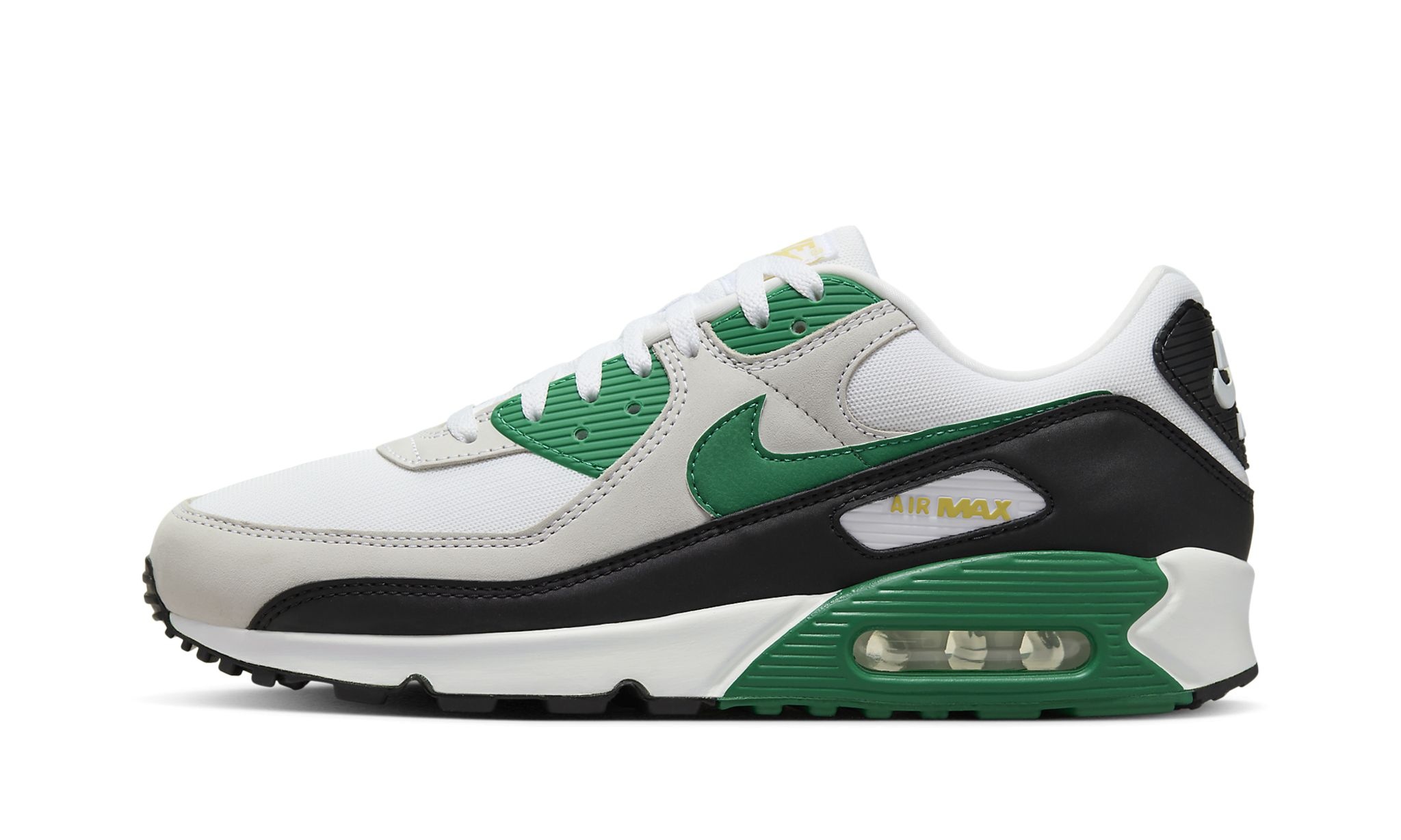 The Nike Air Max 90 “Malachite” is a colorway of the retro running shoe with green, black, and gold accents. The upper features a white mesh base layer contrasted with a light grey synthetic nubuck panel on the midfoot, and a black leather mudguard. A Malachite-colored Swoosh can be found on both sides of the shoe, while an “Air Max” branding window appears on the lateral side of the quarter panel, and classic “Nike Air” detailing is seen on the heel. Moreover, additional branding appears in the form of the “Air Max” detailing on the tongue tag. A Malachite panel surrounds the visible Air unit in the heel of the midsole. Release date: December 26, 2023