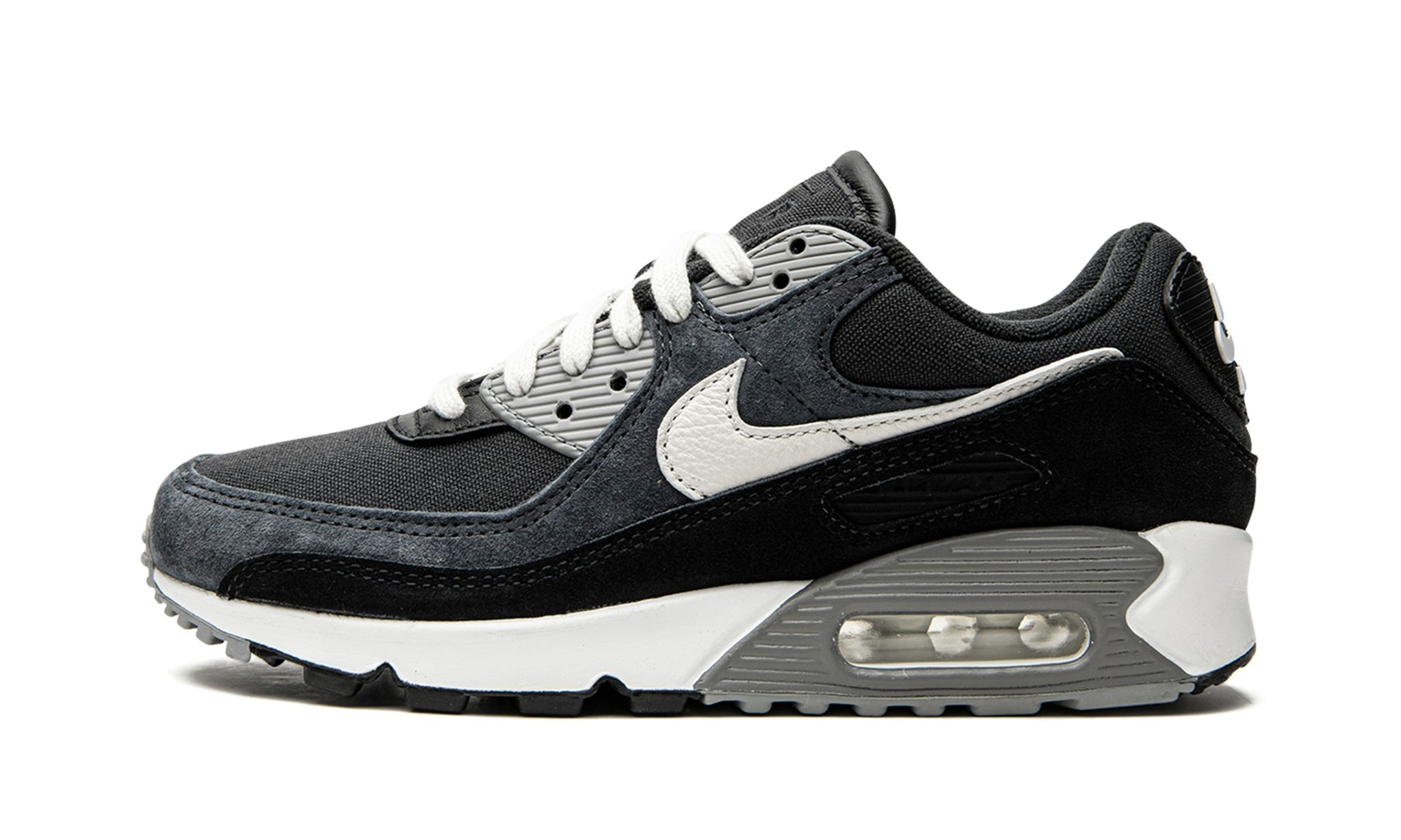 The Nike Air Max 90 “Off Noir” is a shadowy colorway of the retro performance running shoe that was released in October 2021. This premium look for the Air Max 90 combines various durable materials, including suede and canvas, that deviate from the original design of the early ‘90s shoe. Specifically, the upper features a black canvas base with contrasting Particle Grey-colored suede overlays on the toe, forefoot, mid-panel, and collar. A white leather Swoosh is found on both sides and white “Nike Air Max” branding appears on the heel. Grey eyelet panels contrast the white laces on the black canvas tongue with tonal “Air” branding. A black “Air Max” branding window is found within the black suede mudguard. Nike surrounds the clear Air unit in the heel of the white foam midsole with a grey panel to complete the look. Release date: October 13, 2021