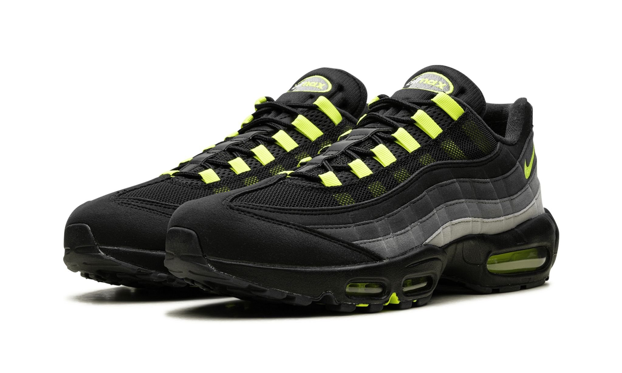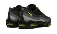 The Nike Air Max 95 "Black Neon" is a colorway of the retro running sneaker inspired by its iconic, original colorway. The Air Max 95 “Neon” serves as the inspiration for the “Black Neon’s” neon green, black, and grey color palette, which essentially flips the color scheme of the original version upside down. The shoe has a black mesh construction with wavy black and grey felt overlays in a gradient design. Neon green accents are found on the eyelets, Swooshes, tongue patch, insole branding, and on the visible Air unit in the black midsole. Various reflective details are found throughout the upper.