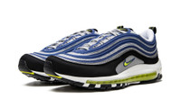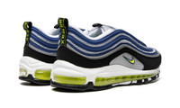 The Nike Air Max 97 “Atlantic Blue/Voltage Yellow” is a colorway of the retro performance running shoe that combines its original “Atlantic Blue” and “Neon” colorways. In 2017, Nike reissued the Air Max 97’s “Atlantic Blue” and “Neon” colorways for the models 20th anniversary, and here, the Swoosh combines both classic styles into one cohesive colorway for the shoe’s 25th anniversary. The “Atlantic Blue/Voltage Yellow” has blue reflective leather panels layered over a Metallic Silver mesh base on the upper. A black mudguard contrasts the look. A Voltage Yellow Swoosh is embroidered on either side above the white foam midsole. Additional neon yellow accents can be found on the Swoosh on the tongue and on the black nylon heel tab. The full-length visible Air cushioning system within the white foam midsole is consistent with the original design of the Air Max 97. Release date: August 23, 2022