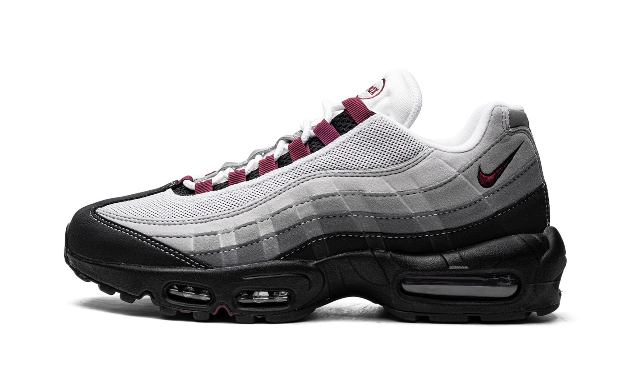 The Nike Air Max 95 OG “Dark Beetroot” brings burgundy accents to the classic white-to-grey color scheme of the iconic sneaker. Using standard Air Max 95 color blocking, shades of white, grey, and black create a gradient from top to bottom for the mesh and felt upper. Dark Beetroot, or more simply, dark red, provides the accent color pops on the eyelets as well as on the tongue’s Air Max logo and mini-Swoosh on the heel. Underfoot is a blacked-out foam midsole with Air Max units in the heel and forefoot.