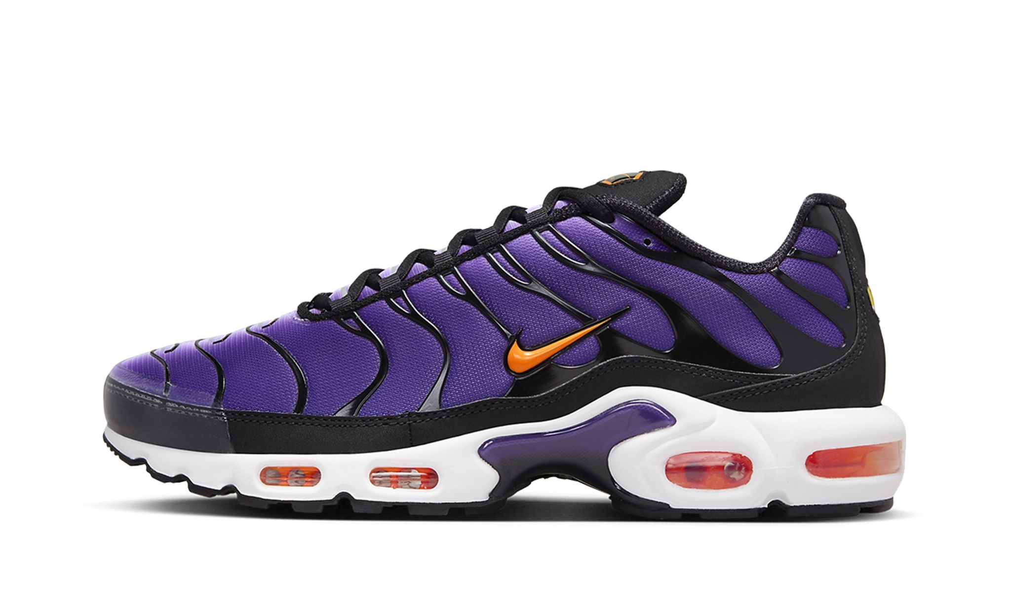 The Nike Air Max Plus "Voltage Purple" is a colorway of the retro performance running shoe with a gradient purple design. Debuted in 1998, the Air Max Plus is one of the most successful sneakers in Nike’s famed Air Max line. On the “Voltage Purple” colorway, which is an original colorway of the shoe from ‘98, the shoe’s upper features a mesh upper contrasted with black wavy TPU overlays throughout the design. A Total Orange Swoosh can be seen on either side. A classic yellow “TN” badge is found on the heel. Underfoot, the white midsole has orange-tinted Max Air units in the forefoot and heel. Release date: January 20, 2024