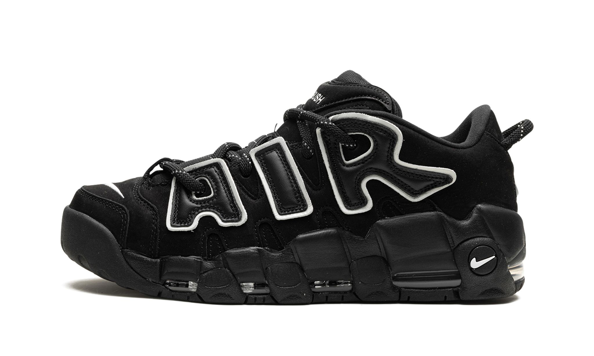 The AMBUSH x Women’s Nike Air More Uptempo Low “Black/White" is a collaboration by the popular luxury jewelry brand on a colorway of the retro basketball sneaker inspired by its original colorway. The Air More Uptempo Low is the modified low-top version of the ‘90s basketball shoe that was most notably worn by Scottie Pippen with the Chicago Bulls in 1996. AMBUSH’s take on the silhouette nods to the classic “Black/White” style that Pippen wore regularly with the Bulls. The upper is complete with a black nubuck construction and oversized, graffiti-inspired white “AIR” branding on the sides. A white Swoosh is embroidered on the toe. “AMBUSH” branding appears on the tongue and heel of the midsole. A black rubber midsole with visible Air units completes the look. Release date: October 6, 2023