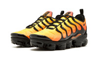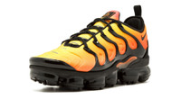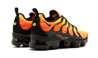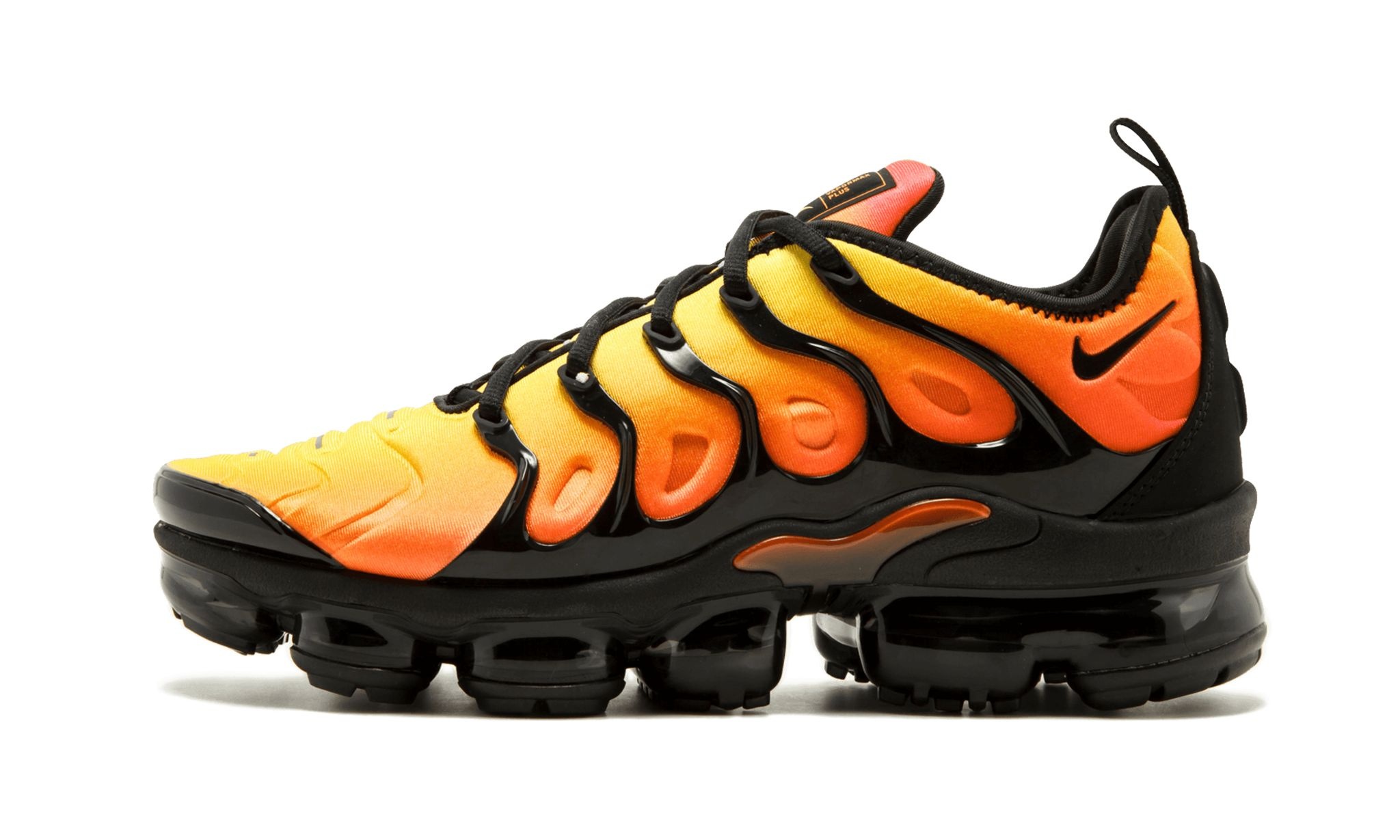 What happens when you combine the classic Nike Air Max Plus with the modern VaporMax? One intense sneaker. The hot new hybrid model is available here in its most blazing colorway, a fiery look inspired by the original and iconic “Tiger” Air Max Plus from 1998. The orange and yellow gradient base is accented with black for the TPU “stripes” across the upper and full-length visible Air unit, creating a sneaker you won’t be able to miss from a mile away. Released in slightly more limited quantities and locations than the rest of the initial batch of the model’s colorways in January 2018, the VaporMax Plus Black/Total Orange is in stock here at Stadium Goods and ready to be added to your sneaker rotation. If you’re bold enough to wear a pair, that is.