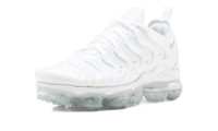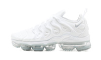 The Nike Air VaporMax Plus “Triple White” combines the design language of Nike’s Air Max Plus and Air VaporMax into one progressively-styled silhouette. Undeniably comfortable, the Air VaporMax Plus is cast in an all-white synthetic nubuck and neoprene construction. Tonal glossy TPU overlays on both sides assist in supporting the lacing structure. A Pure Platinum Swoosh appears on the collar and an Air Max Plus-inspired “Vm Air” emblem can be found on the heel. Tonal “Nike” insignia appears on the white tongue tag as a continuation of the model’s monochromatic white aesthetic. Nike finishes the look off with full-length visible VaporMax Air bubbles beneath the white midsole. Release date: February 9, 2018.