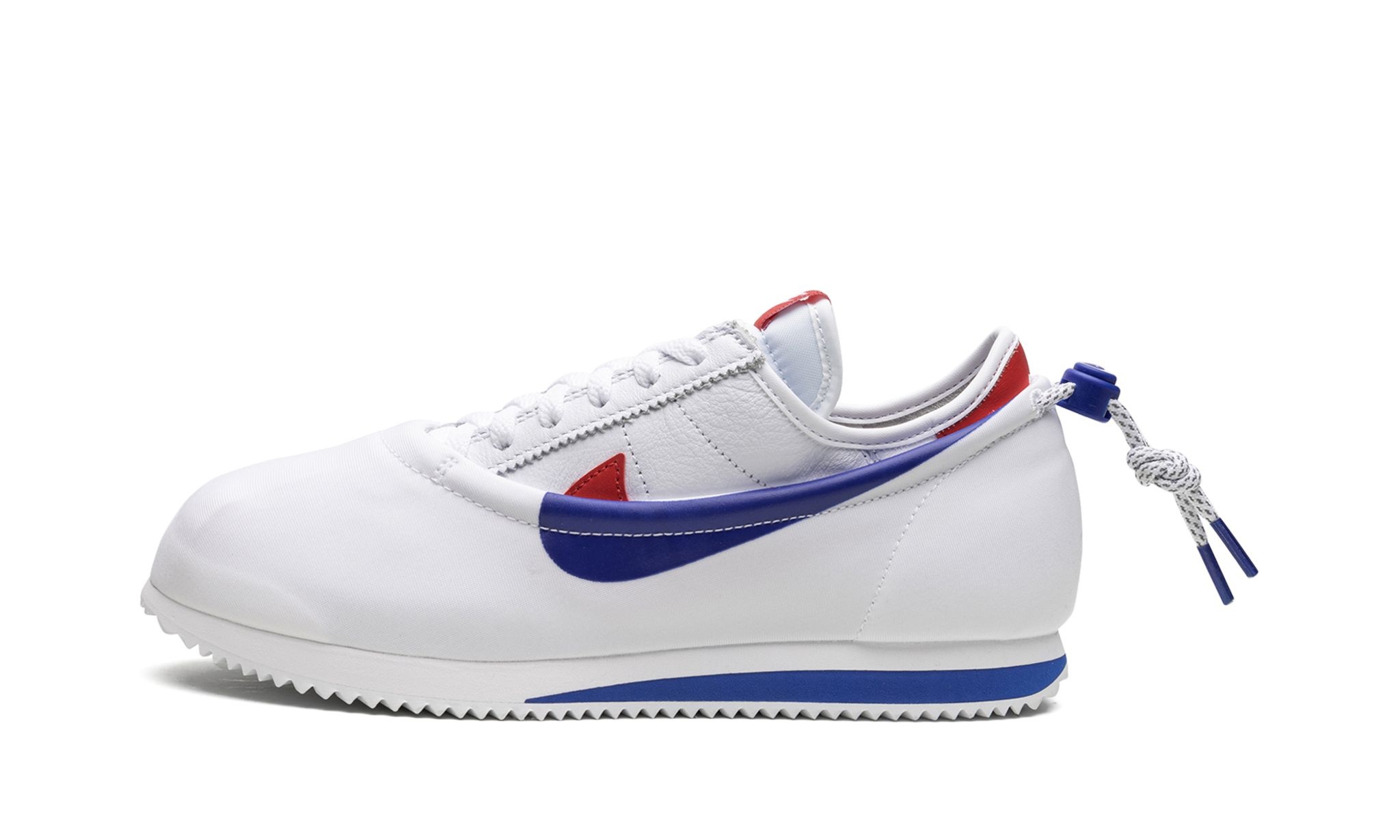 The Clot x Nike Cortez “Forrest Gump” is a collaboration between the popular streetwear brand and Nike on a progressively styled version of the retro running shoe. The “Forrest Gump” is the third installment of Clot’s Edison Chen’s vision of the Nike Cortez that combines a unique three-in-one build. This classic white, red, and blue Cortez colorway is now nicknamed “Forrest Gump” because they appear in the classic film from 1994 of the same name. The shoe features a white leather construction with a contrasting red Swoosh on the sides. An outer shell made from white leather envelops the base of the design and features a blue Swoosh on the sides and drawstring cord on the heel. Chinese characters on the heel spell out “Kung Fu.” The white midsole is paired with a ridged outsole. Release date: April 14, 2023