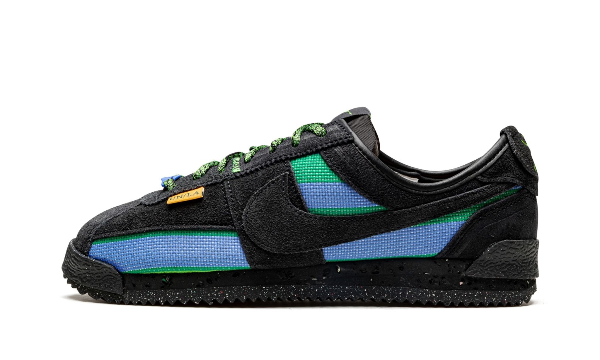 The Union x Nike Cortez “Black/Blue” is a collaboration between the Los Angeles based clothing and sneaker boutique and Nike on the retro running shoe that honors both the model’s legacy, as well as its caché in the greater Los Angeles area. Also celebrating the Nike Cortez's 50th anniversary in 2022, the Union co-designed “Black/Blue” updates the silhouette with its signature colors and textures for a look unlike anything ever seen before as it pertains to the classic shoe. Black suede overlays contrast the striped knit base. Bright green accenting appears on the heel overlay with Union’s “Frontman” logo. Additional green detailing comes into play on the tongue tag and on the suede overlay on the base of the vamp. The lower portion of the shoe is made from sustainable materials as Nike’s recycled Crater Foam and Grind textiles comprise the midsole and outsole, respectively. Release date: June 21, 2022