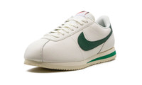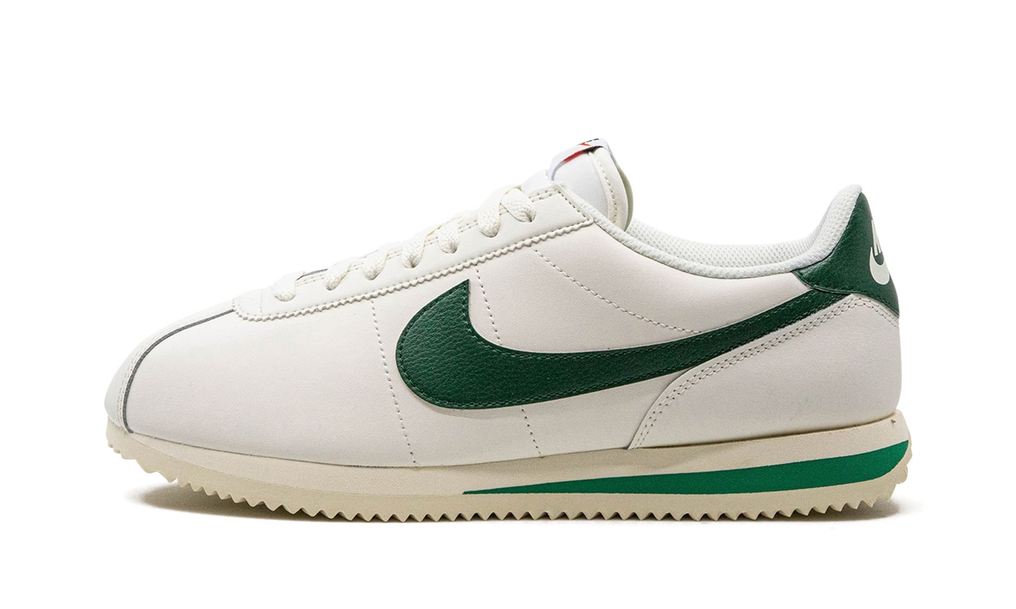 The Nike Cortez “Sail/Gorge Green” is a classic-looking colorway of the retro running and casual shoe. The “Sail/Gorge Green” Cortez features a vintage-inspired look with a Sail leather construction with Gorge Green leather Swoosh branding on the sides. The green leather heel tab features white “NIke” and Swoosh logos. A classic “Nike” patch appears on the tongue tag. Underfoot, a cream foam midsole with Gorge Green accenting completes the look.