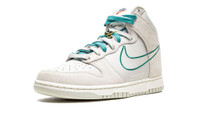 Light grey suede/leather Dunk High SE "First Use - Green Noise" sneakers from NIKE featuring signature Swoosh logo detail, contrasting panel detail, round toe, perforated detailing, front lace-up fastening, logo patch at the tongue, ankle-length, branded insole and rubber sole. These styles are supplied by a premium sneaker marketplace. Stocking only the most sought-after footwear, they source and curate some of the most hard to find sneakers from around the world..