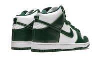 The Nike Dunk High “Spartan Green” employs the team uniform colors of the Michigan State Spartans on the ever-popular Dunk silhouette. This Fall 2020 release is a sequel to the “Spartan Green” colorway that was originally released on the Nike Dunk Low in 2008. Also inspired by the “Be True to Your School Pack” from 1985, this “Spartan Green” color scheme on the high-top Dunk is undoubtedly a classic design. Details include a white leather base that is visible on the perforated toe, mid-panel, and collar. Rich Pro Green leather overlays can be found on the forefoot, eyelets, collar, and heel. The white nylon tongue features green “Nike” insignia. Additional branding appears in the form of a green leather Swoosh hit on the sides of the shoe. A white rubber midsole and green outsole put the finishing touches on one of the top Dunk colorways of 2020. Release date: September 18, 2020.