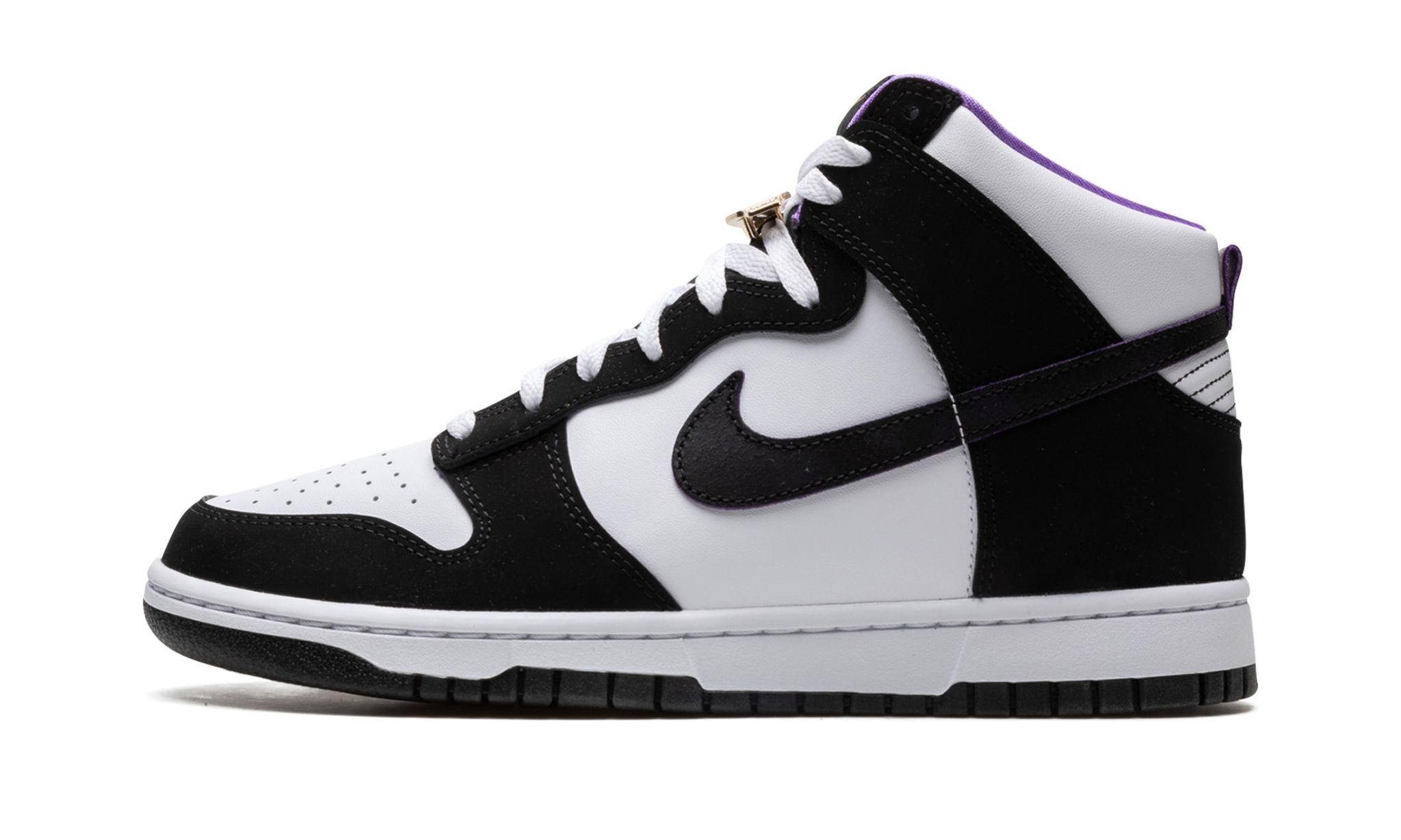 The Nike Dunk High “World Champ” is a two-tone, white-and-black colorway of the retro basketball shoe inspired by none other than professional wrestling. The “World Champ” is designed in the Dunk’s beloved “Panda” or “White/Black” color block, but with a twist. It features a gold lace dubrae shaped in the design of a wrestling championship belt. Additional gold accents come into play on the “Nike” and Swoosh logos on the black nylon tongue tag. Purple inner lining adds a pop of color. The shoe’s base is designed in white leather while the overlays and Swoosh appear in black leather. Release date: September 17, 2022