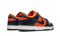 The Nike Dunk Low Retro “Champ Colors” is a special colorway dedicated to the 2019 Men’s NCAA Basketball Champion Virginia Cavaliers. The Cavaliers’ orange and blue team uniform colors appear on this low-top silhouette as part of the Dunks’ 35th Anniversary celebration in 2020. Undoubtedly inspired by the “Be True to Your School” pack from 1985 which featured Dunks in exclusive colorways dedicated to some of the top college basketball programs in the country, this modern shoe features orange leather on the perforated toe, mid-panel, collar, and heel. Navy leather overlays appear on the forefoot, eyelets, and heel. A blue leather Swoosh graces both sides and orange embroidered Nike detailing dots the heel. The stark white midsole is contrasted by a blue outsole. The Nike Dunk Low Retro “Champ Colors” was released on June 24, 2020.
