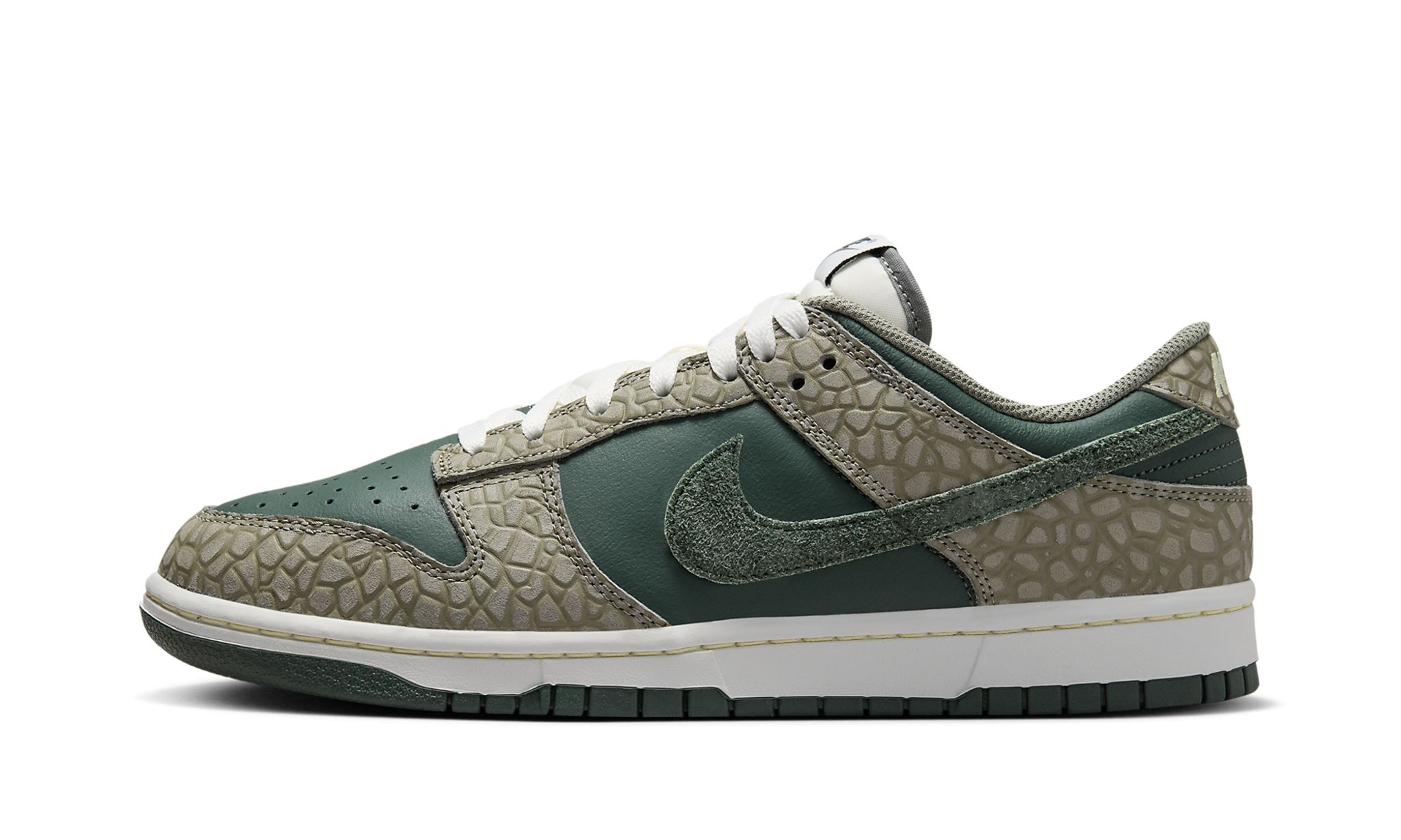 The Nike Dunk Low “Urban Landscape 2.0” is a colorway of the retro basketball shoe with an outdoors-inspired design. The “Urban Landscape 2.0” features scale-like overlays for a turtle-inspired look, which ties into the shoe’s nickname. Specifically, the upper has a green leather base and reptilian-like, green textured overlays. A green suede Swoosh appears on either side, while classic “Nike” branding is found on the tongue tag and heel. Underfoot, a white midsole and green outsole and yellow contrast stitching complete the look of the turtle-inspired colorway. Release date: April 1, 2024
