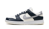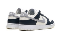 The Nike Women's Dunk Low 'Sail Armory Navy' features a grey Swoosh on an off-white leather upper. Contrasting navy leather overlays reinforce the forefoot and heel.