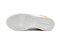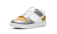 The Women’s Nike Dunk Low “Gold/White/Silver” is a women’s-exclusive colorway of the sneaker that combines flashy metallic gold and silver overlays against a clean white base. Nike released the Dunk in “Gold/White/Silver” in February 2022 as part of its Spring 2022 footwear lineup. The perforated toe and heel overlay are designed in Metallic Gold. The eyelets, mid-panel, and top heel block appear in crisp white tumbled leather. Contrasting Metallic Silver leather is found on the toe cap and forefoot panels, as well as on the collar and heel tab with red “Nike” branding. Classic “Nike” script detailing appears with a black Swoosh on the tongue tag. A luxury-inspired gold chain “Nike” lace dubrae on the vamp completes the look. Release date: February 7, 2022
