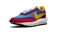 The sacai x Nike LDWaffle Trainer “Varsity Blue/Varsity Red” is a unique collaboration by the Japanese high-fashion label and Nike. The first-of-its-kind design is a hybrid model that layers two vintage Nike running shoes on top of each other, the LDV and the Waffle Racer. With a mesh base, the upper features double suede panels, double Swooshes, double tongues, and optional double laces. The foam midsole follows the same concept, stacking two sole units on top of one another. This colorway features the Waffle Racer elements in Varsity Blue and silver, and the LDV panels in Varsity Red and yellow Del Sol. The limited edition sacai x Nike LDWaffle Trainer “Varsity Blue/Varsity Red” released in spring 2019.