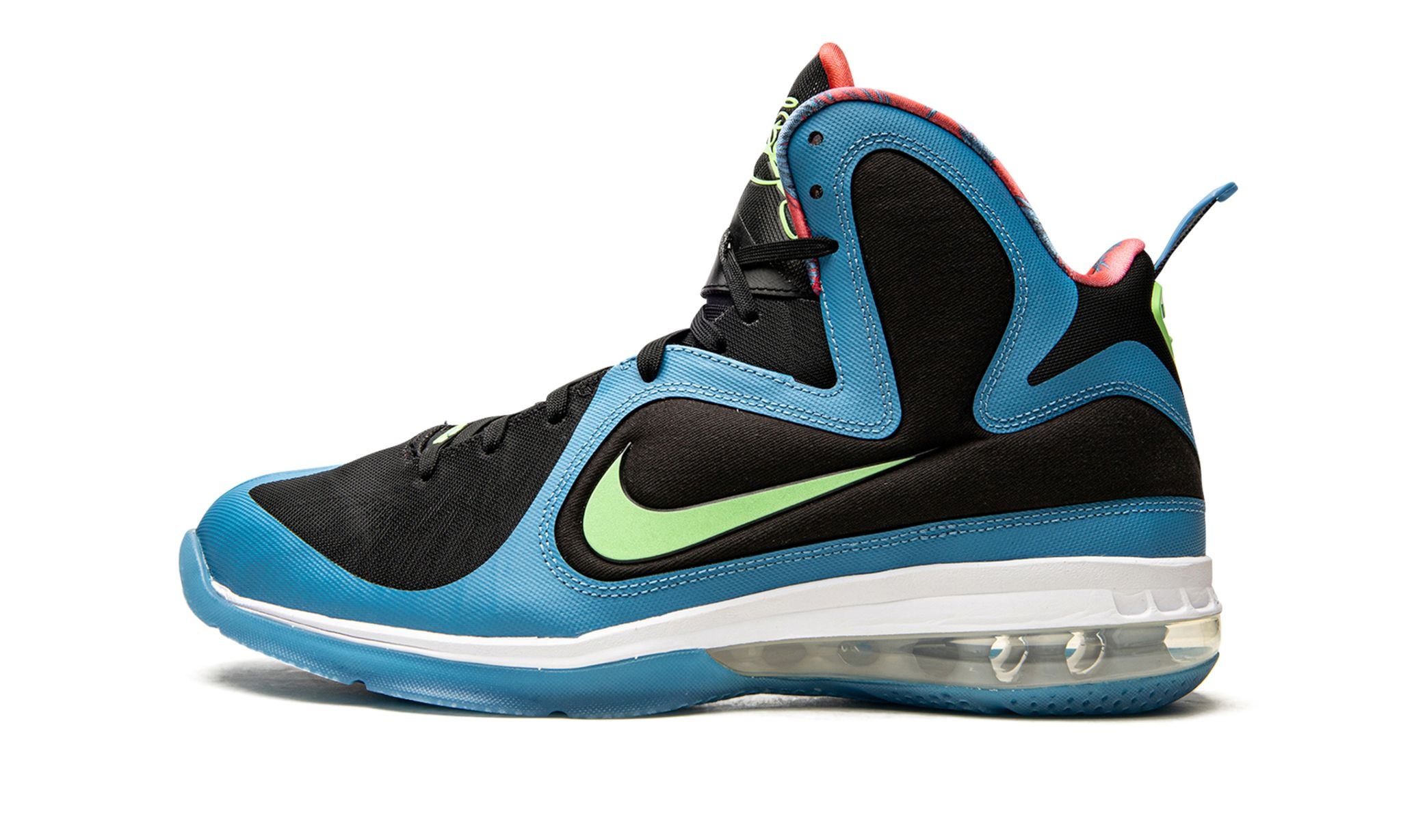 The Nike LeBron 9 Retro “South Coast” is a January 2022 retro release of LeBron James’s ninth signature shoe with. The “South Coast” LeBron 9 is dedicated to LeBron’s basketball journey to Miami, Florida, specifically his time as a member of the Miami Heat, and inspired by the infamous “South Beach” LeBron 8. The upper features a black mesh construction that’s knitted with Nike’s Flywire technology for support and durability. Bright blue Fuse overlays contrast the black base. Lime green and hot pink accents add to the tropical theme. The white Phylon midsole is paired with a full-length, toe-to-heel visible Max Air cushioning unit for a responsive ride whether on the basketball court or in the streets. Release date: January 20, 2022