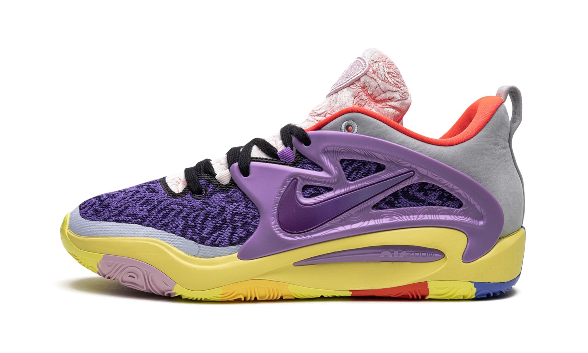 The Nike KD 15 “What the” is a unique colorway of Kevin Durant’s fifteenth signature shoe that combines various elements of previous Nike KD styles. The popular and creative “What the” theme lands on the KD 15, giving the shoe a head-turning appearance. The shoe features components from different Nike KD models, with all-over patterning on the left tongue and a pink textile on the right tongue. The base and overlays of each shoe have a mismatched design. Glow-in-the-dark TPU “wings” assist in supporting the lacing system. Durant’s “EA$Y” nickname appears on the pull tabs and his former “7” jersey number with the Brooklyn Nets is found on the lower heel. Release date: May 5, 2023