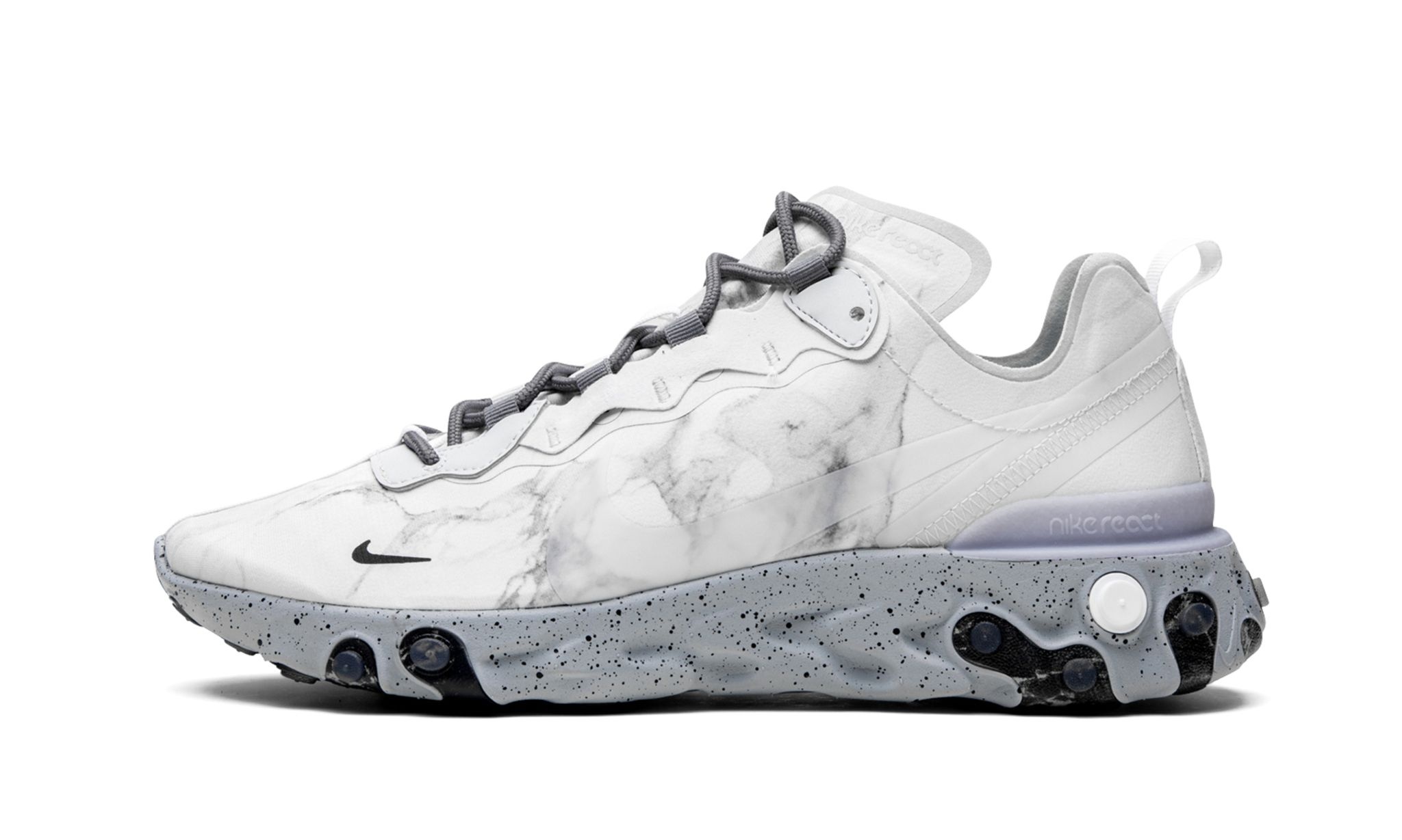 The Kendrick Lamar x Nike React Element 55 is a special collaboration imagined by the Grammy Award-winning rapper. Following up his four Cortez Kenny models, the futuristic React Element 55 sports a marbled colorway reminiscent of Lamar’s Reebok Club C from back when he was collaborating with Reebok. A split color motif makes up either pair with grey rope laces contrasting the upper. Mini Swoosh branding is located on the forefoot and heel. The collaborative React Element 55 dons a black speckled grey foam midsole with a black marbled rubber outsole to complete the striking design. Release date: November 5, 2019.