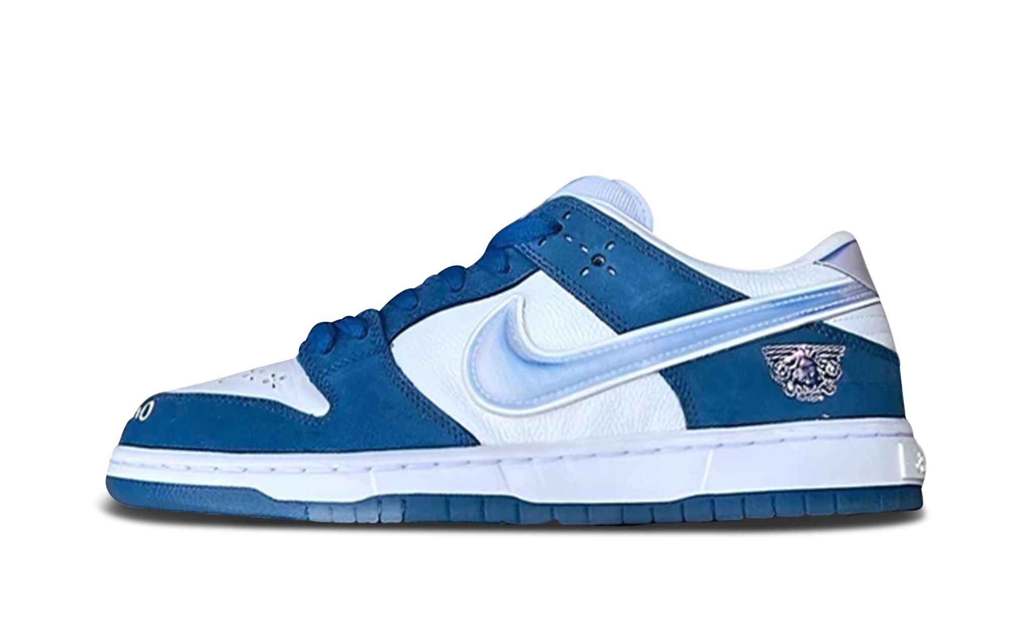 The Born x Raised x Nike SB Dunk Low “One Block at a Time” is the first-ever collaboration between the California-based streetwear brand and Nike SB on the iconic skate shoe. The “One Block at a Time” SB Dunk by Born x Raised features a decidedly “Los Angeles” look, as the shoe’s white and blue color block is undoubtedly inspired by the Los Angeles Dodgers’ team uniforms. The shoe features a white leather base with blue nubuck overlays and unique perforations on the toe. “One Block at a Time” is embroidered on the front of the toe cap across both shoes. A pink branding emblem appears on the lateral side of the heel. The side Swooshes are featured in an iridescent material with a puffed effect. The shoe is mounted on a white rubber midsole. A “Born SB” graphic is found underneath the clear rubber outsole. Release date: June 1, 2023