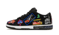 The Neckface x Nike SB Dunk Low is a collaboration between the Los Angeles based graffiti artist and Nike SB on a colorway of the skate shoe with the former’s signature graphics. A collaboration that dates back to 2013 when Neckface and Nike SB’s worked together on SB Dunk High and SB Blazer colorways, the pair renewed their relationship to great success on the SB Dunk Low in 2022. Neckface’s macabre designs appear on patches placed in an all-over style pattern on the shoe’s black suede upper. Mismatched “Nike SB” and “Neckface” branding is found on the tongue tag of the left and right shoe, respectively. A small white embroidered Swoosh appears on the lateral side of the forefoot. A “SHOCKERS” patch is attached to heel of the left shoe’s white rubber midsole. Release date: October 27, 2022