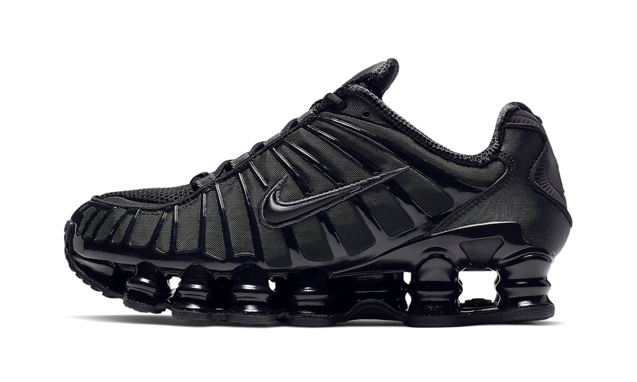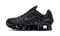 The Women’s Nike Shox TL "Black" is a women’s-exclusive colorway of the retro sneaker with a mostly monochromatic black appearance. The shoe’s design features a black fabric construction with tonal TPU overlays. A black patent leather Swoosh logo appears on either side of the shoe. Red “Nike Shox” branding is seen on the tongue. The Shox TL’s signature piston-shaped columns underfoot provide both a comfortable and responsive ride, as well as a vintage, Y2K-era flair. Release date: July 25, 2023