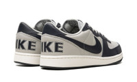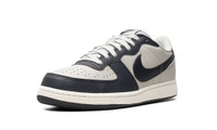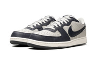 The Nike Terminator Low "Georgetown" is the low-top version of the retro basketball shoe in its original colorway. The Terminator High debuted in 1985 in this colorway inspired by the Georgetown Hoyas college basketball team. The sneaker was brought back by Nike in 2022, and offered in this low-top edition in 2023. The shoe features a Granite leather base with contrasting navy overlays on the eyelets, forefoot, toe cap, and heel. A navy leather Swoosh appears on the sides. An oversized “NIKE” logo appears on the back of the shoe. A cream-colored rubber midsole plays into the Terminator’s throwback vibe. Release date: August 1, 2023
