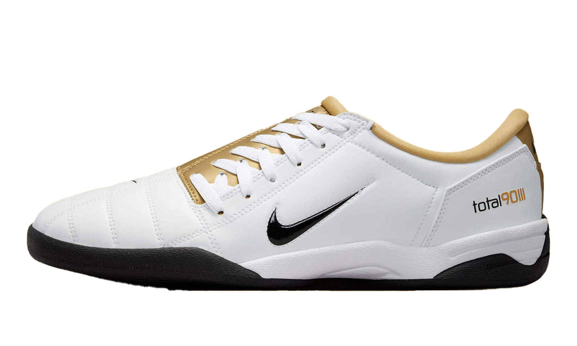 Discover the Nike Total 90 3 SP "White Metallic Gold" (HJ9351 101), a classic re-release that blends iconic design with modern appeal. This sneaker features a pristine white base complemented by radiant metallic gold accents, offering a sophisticated yet athletic aesthetic. Experience the legacy of the Total 90 series with enhanced performance and eye-catching style.