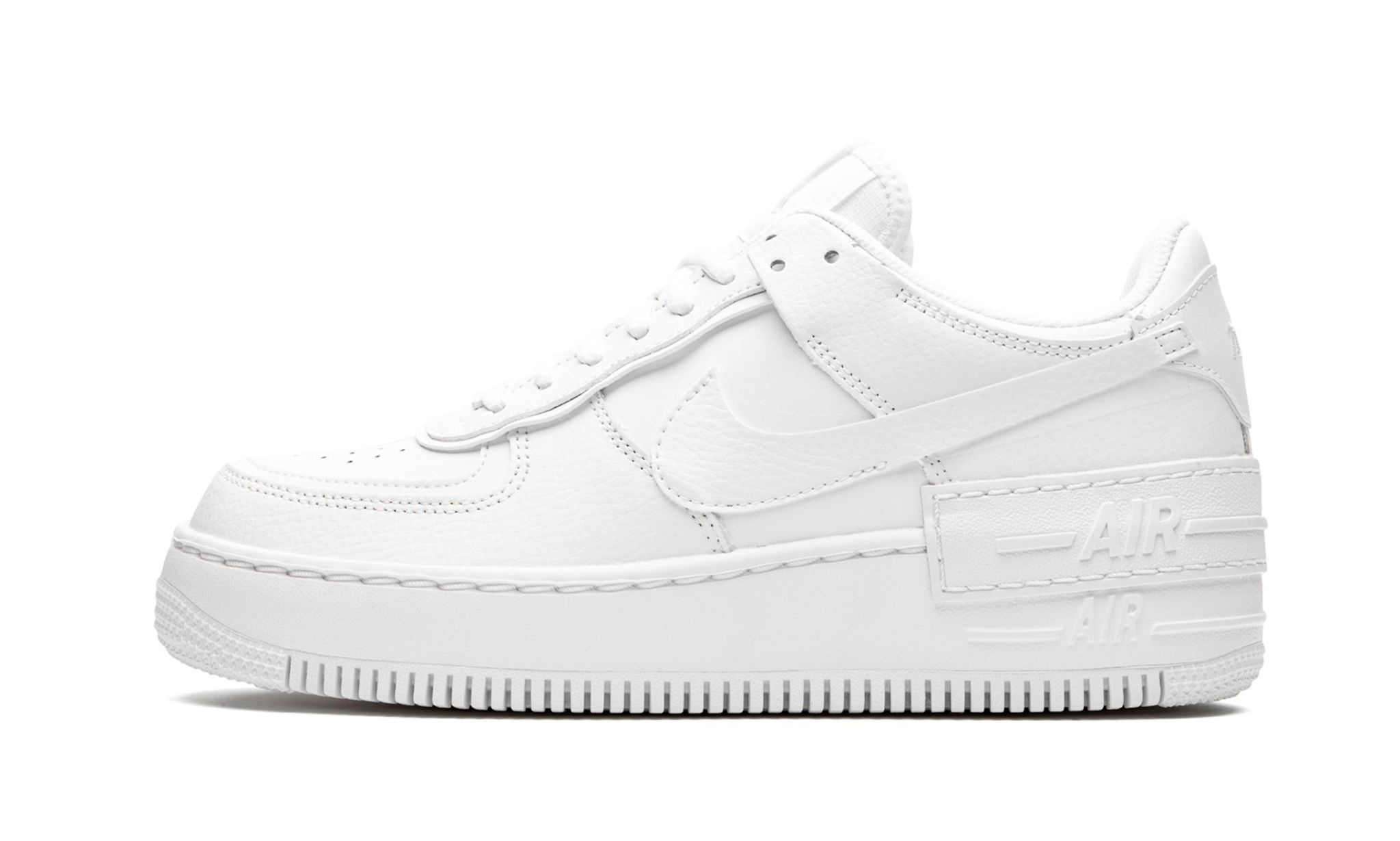 The Nike Air Force 1 Shadow "Triple White" features an empowering design that's inspired by women of the next generation who are trailblazers and a force for good. The women's-specific style updates the iconic AF1 silhouette with a layered look that includes double the details with two eyestays, mudguards, back tabs, and Swoosh designs. The colorway is pristine with a triple white application. At the back, the sneaker sees dual "Air" branding and the stripped-back style is finished with a stacked sole and grooved outsole.