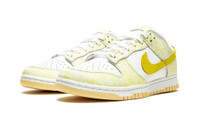 The Women’s Nike Dunk Low “Yellow Strike” is a women’s-only colorway of the retro basketball shoe that was released in August 2021. Similar to the shoe’s “Purple Pulse” style, the “Yellow Strike” displays white leather on the perforated toe and mid-panel with contrasting blotted patterning on the overlaid panels, in this case, yellow instead of purple. A yellow suede Swoosh appears on either side and yellow “Nike” branding is stitched onto the back of the shoe. Moreover, yellow “Nike” with a Swoosh appears on the tongue tag. The “Yellow Strike” features a unique design trait: the laces change color when exposed to sunlight. Release date: August 18, 2021
