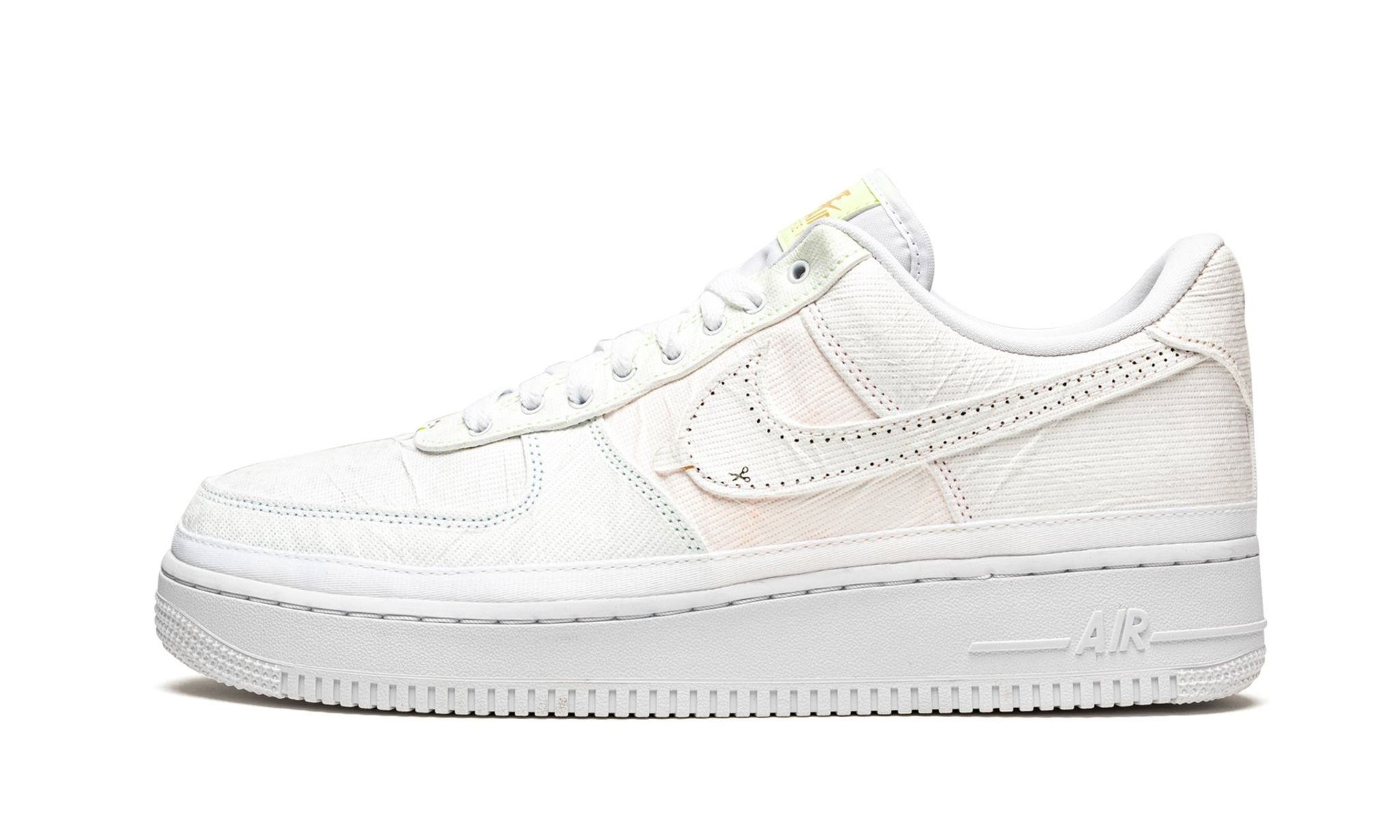 The Women’s Nike Air Force 1 Low PRM “Pastel Reveal” is a women’s exclusive colorway of the lifestyle shoe that features hidden, multicolor panels beneath its original design. Nike makes a coy reference to the model’s tearaway style with a cheeky scissors graphic on the Arctic Punch Swoosh that resides on both sides. Moreover, Nike adds a “tear here” logo to the throat. The rest of the upper is dressed in the same cream-colored textile as the aforementioned Swoosh. Removing the outer layer reveals leather panels in various pastel colors. Question marks appear on the sockliner to further the mysterious nature of the colorway. Release date: June 2, 2021