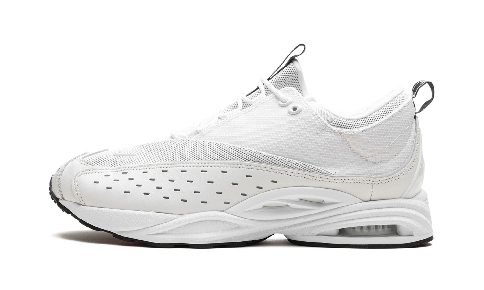 The NOCTA x Nike Zoom Drive “Summit White” is a collaboration by Drake and Nike on a crisp, white-based colorway of the retro sneaker. Before it was reissued with the help of Drake in 2024, the Nike Zoom Drive was originally designed by Tinker Hatfield and released in 1999 as part of the “Alpha Project.” Here, the “Summit White” colorway has an all-white appearance made from a combination of White and Summit White ballistic mesh, ripstop nylon, and leather. The shoe’s all-white look continues on the TPU overlays. Black pull tabs with “NOCTA” branding break up the shoe’s neutral appearance. Underfoot, visible Air cushioning in the heel completes the look. Release date: February 22, 2024